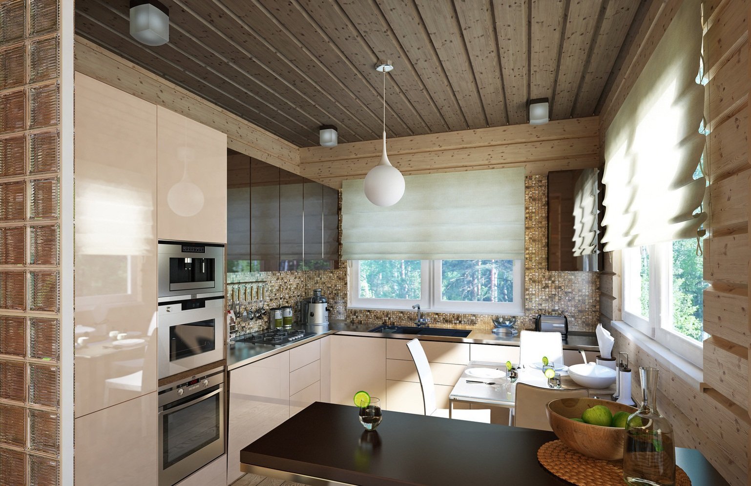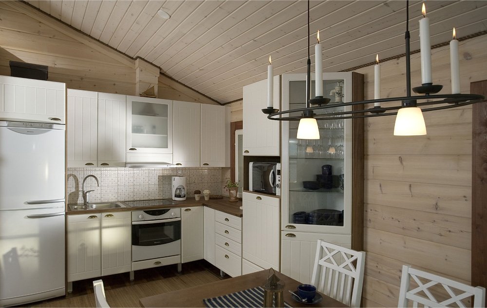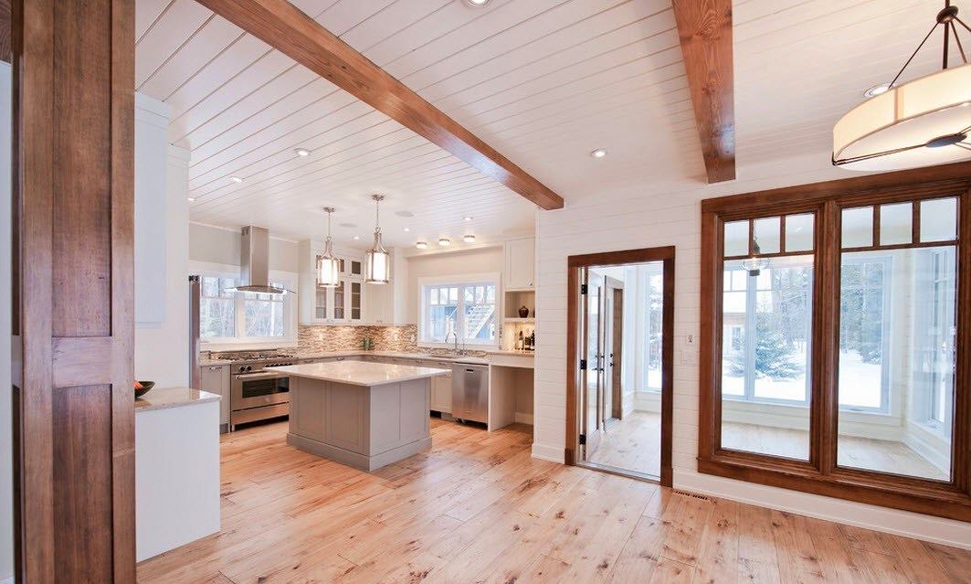Implica el uso de un acabado marrón claro (tanto para paredes como para el piso) con leves notas de amarillo o rojizo. Se recomienda utilizar materiales ligeramente diferentes para la decoración de paredes y pisos. Pero el techo está mejor revestido de madera de color crema claro. La cálida cocina siempre mantiene una atmósfera positiva y hogareña.
