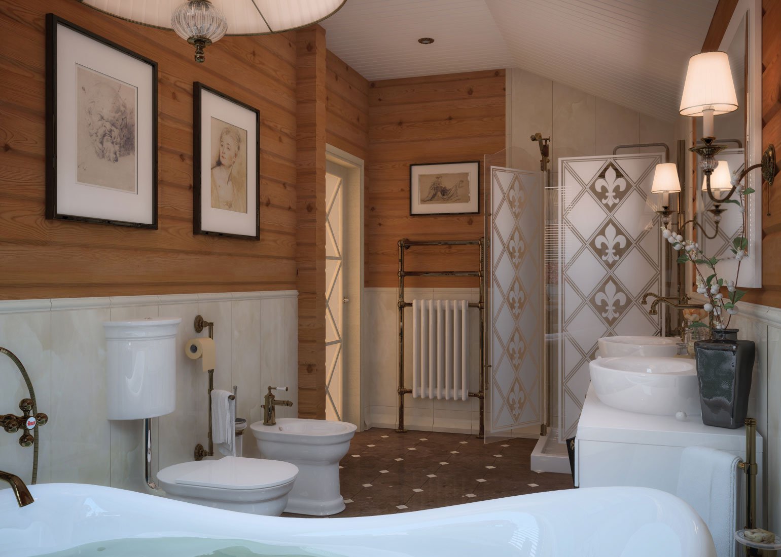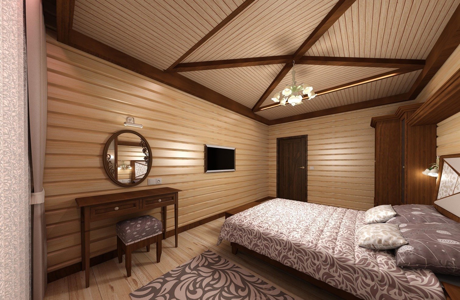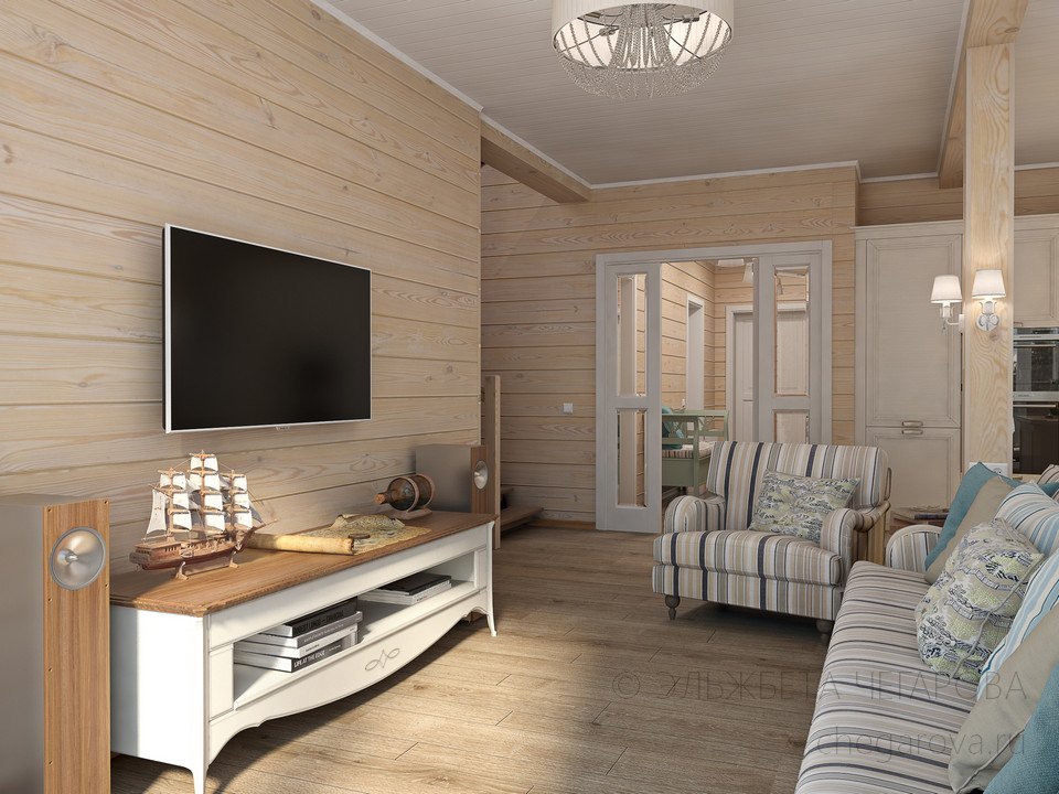 ethno: pintura brillante de tableros seleccionados para decoración, una gran opción para la implementación de un estilo inusual; necesariamente las paredes con imitación de la viga deberán estar decoradas con paneles y otra decoración brillante;