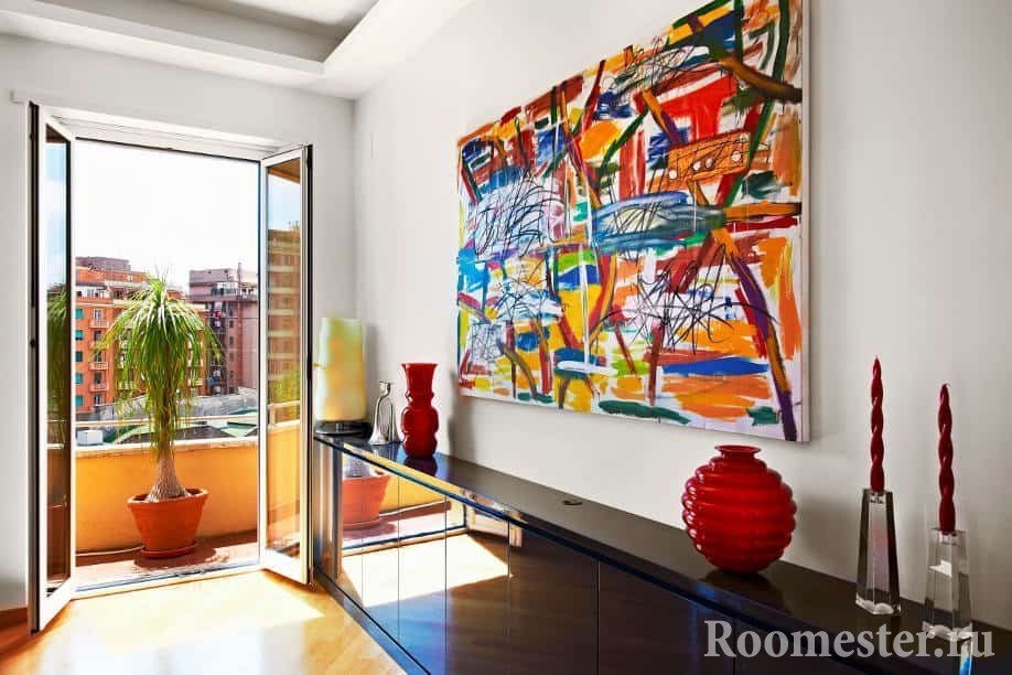 - El minimalismo ayudará a diluir la pintura brillante, que se convertirá en el énfasis principal en la habitación.