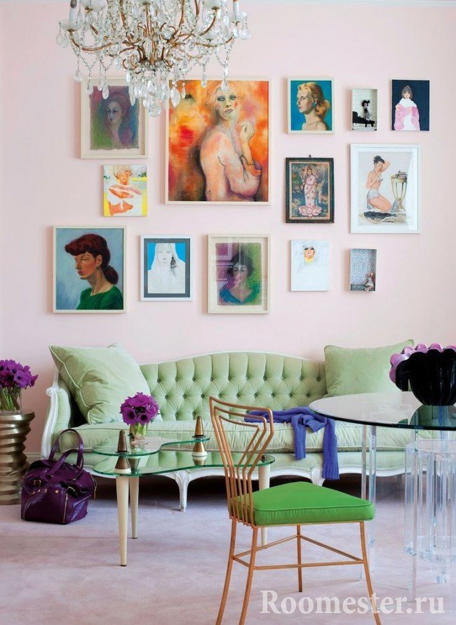 - Ubicación Idealmente, si el centro de la imagen está al ras de los ojos. Si dos o tres pinturas de diferentes tamaños se encuentran en una pared, la alineación se produce en el límite inferior. Sin embargo, las soluciones de diseño modernas le permiten distribuir pequeñas pinturas al azar.