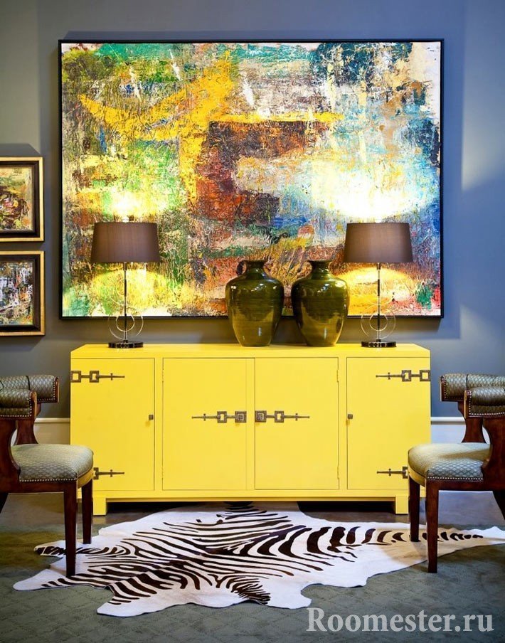 - Los lienzos en los que el color principal se cruza con el color de otros elementos decorativos: almohadas, colchas, cortinas ayudarán a completar la composición de la habitación.
