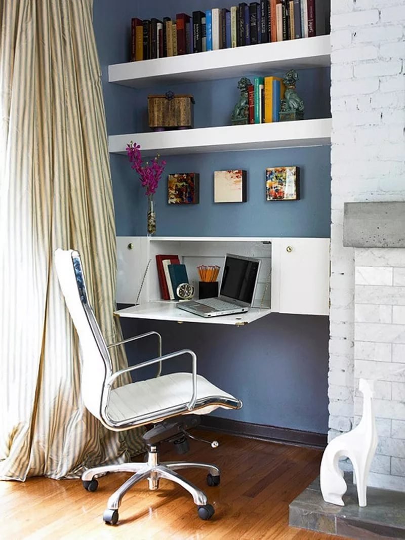 Cuando el techo está inclinado en la habitación, y si la habitación es un ático, el receso natural se puede utilizar para organizar el espacio de trabajo.