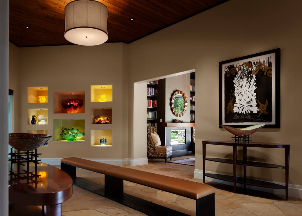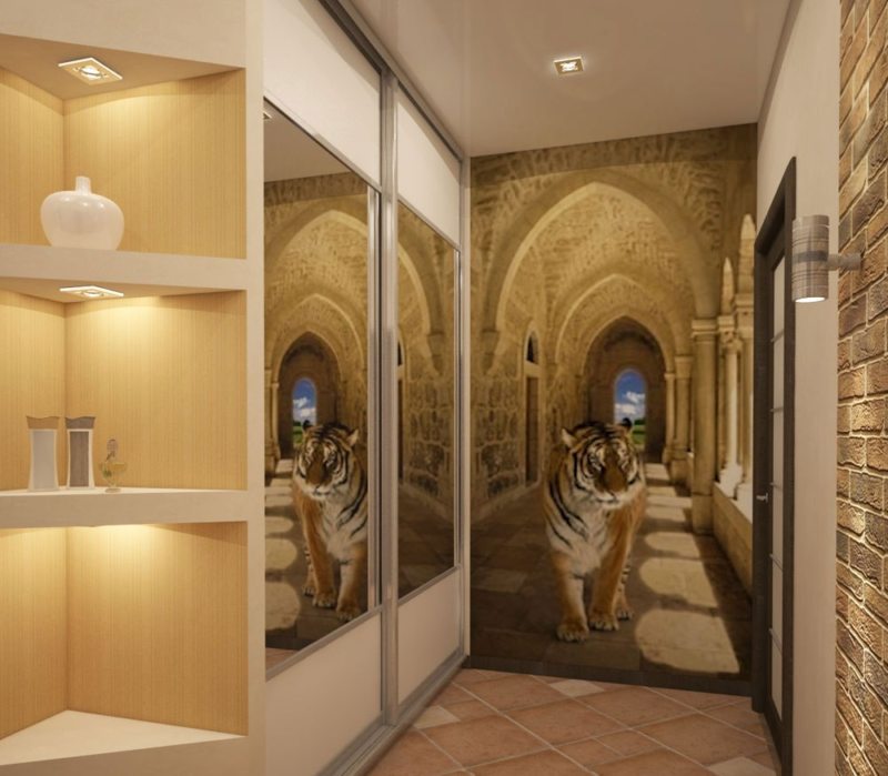 La decoración de un pasillo con un receso depende de la altura del techo. Las paredes demasiado altas pueden aterrizarse visualmente mediante nichos ubicados ligeramente por debajo del nivel del ojo. Un pasillo con un techo bajo se puede extraer visualmente con huecos ubicados debajo del techo o por encima del centro de la pared.