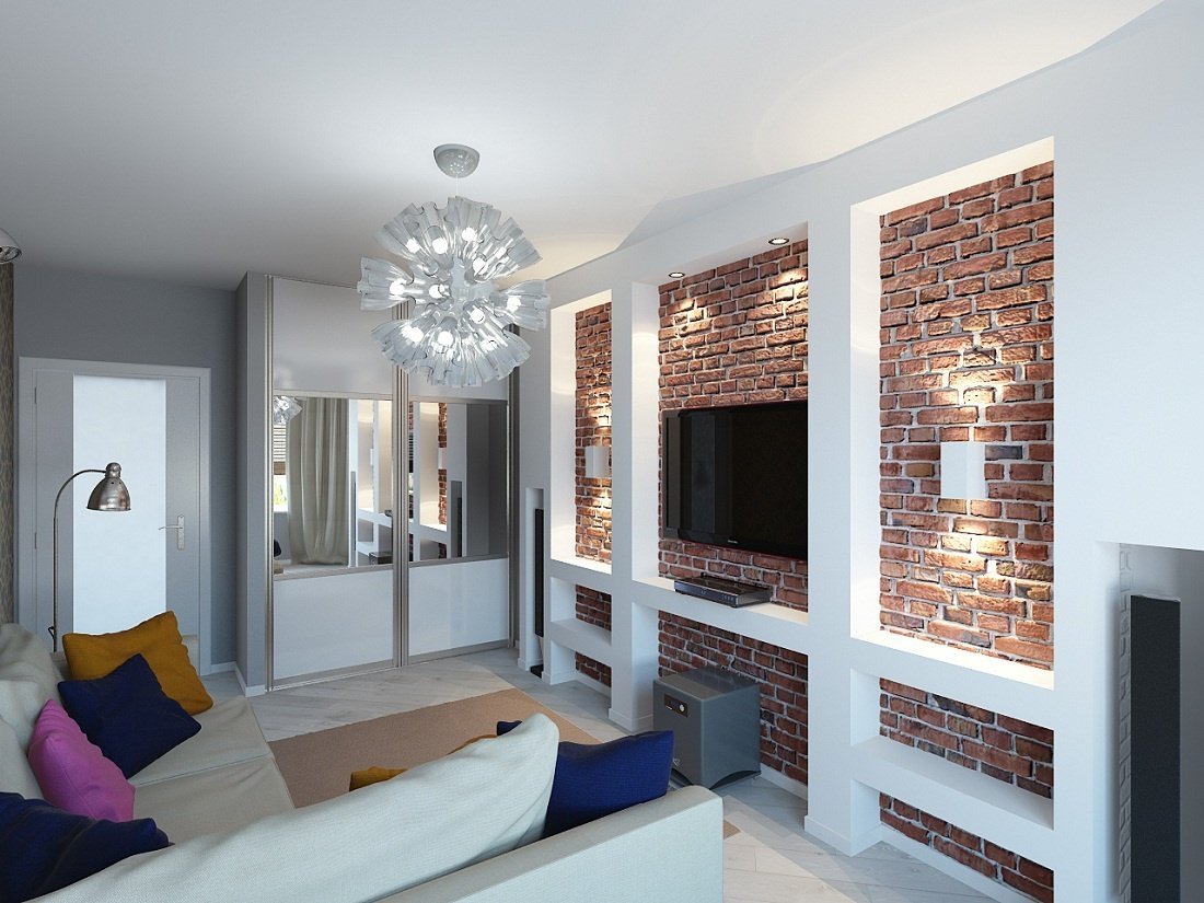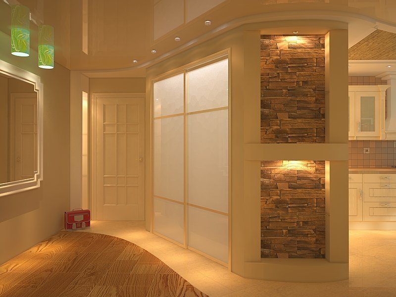 En el pasillo, este elemento de decoración se combina con un estante de TV. Usar como elemento espacio de zonificación. Las paredes vacías se llenan de esta manera.