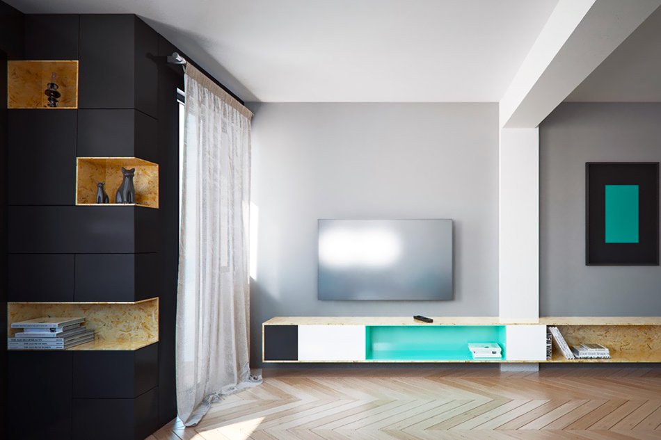 Estos huecos se combinan con muebles bajos. Es esta versión del conjunto de muebles que enfatiza mejor las ventajas de los nichos horizontales.