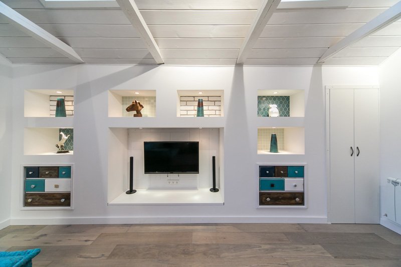 En la sala de estar, el espacio sobresaliente junto a la chimenea se complementa con nichos en toda la pared. Hay libros, almohadas y más.