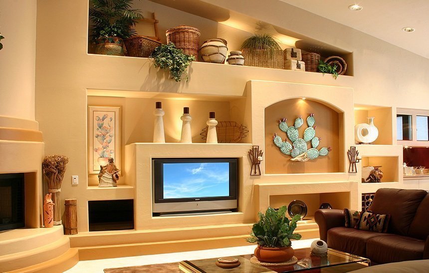 Los nichos cerca de los muebles están decorados con murales, pinturas, acentos de colores vibrantes e iluminación. Están sombreados con yeso decorativo, papel tapiz y dibujos. Decorado con columnas, puertas y molduras de estuco.