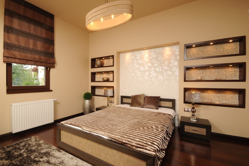Las formas de los nichos en las habitaciones pueden ser cualquiera. Muy a menudo, parecen cúpulas orientales, arcos, estantes rectangulares, huecos estándar. Varias opciones para esta decoración en el dormitorio se ven geniales.