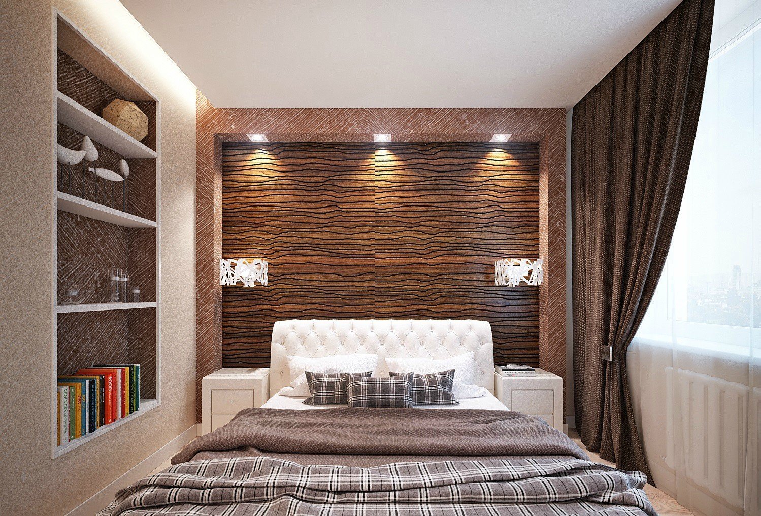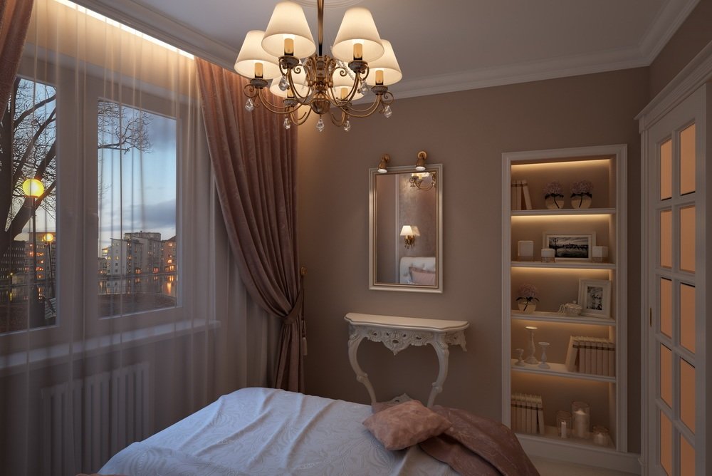Área para una cama. Un sofá o una cama colocada en un receso se ve orgánicamente. Este método ahorra el área de la habitación, hace que la composición interior general sea más compleja y armoniosa;