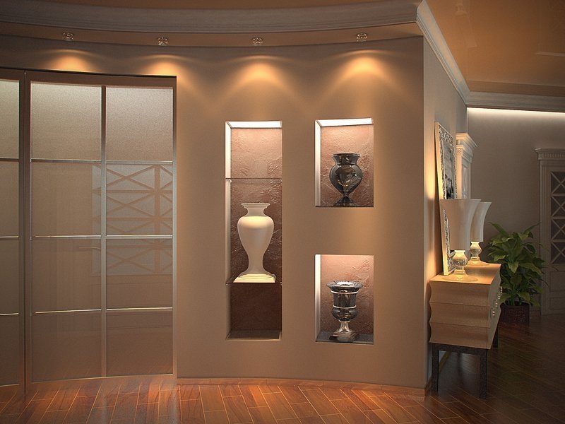 Un amplio receso puede alargar visualmente la habitación. El uso de este elemento de decoración se puede encontrar en salas de estar y pasillos. El nicho ubicado sobre el nivel de los ojos resuelve el problema de un techo bajo, como si lo levantara unos centímetros.