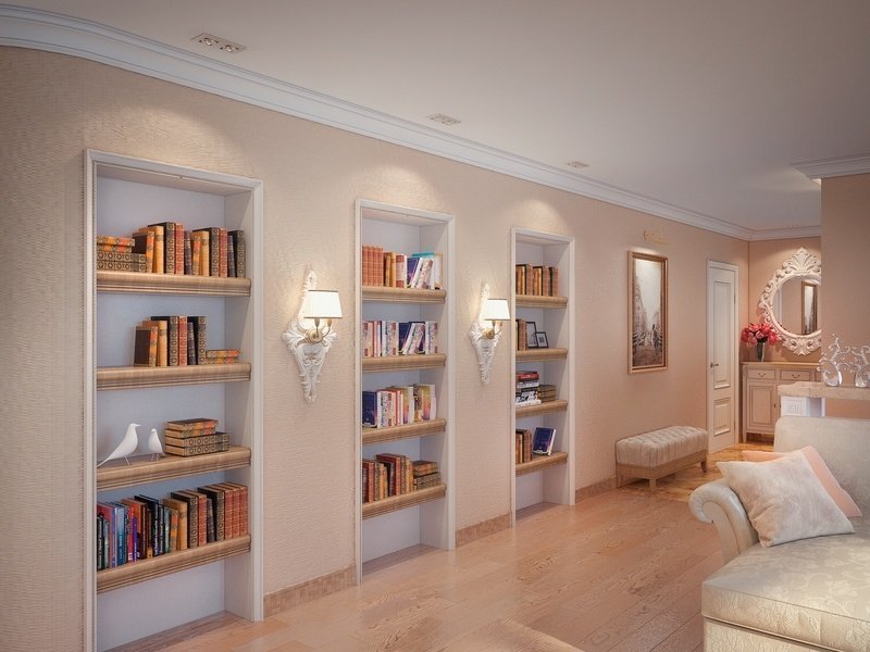 ¿Cuál de los recovecos es el armario? Además de ser inusual, también salva el área de la habitación. Abajo las opciones de gabinetes aburridos, un nicho se encargará de este propósito mucho mejor, por ejemplo, un nicho de libro se puede decorar con columnas. Entonces los libros en los estantes serán más visibles y significativos. Armario empotrado complementos perchas para ropa, armarios para zapatos. Un gabinete de un nicho para artesanías y joyas puede equiparse con estantes transparentes para que la belleza de los contenidos sea máximamente visible para los demás.