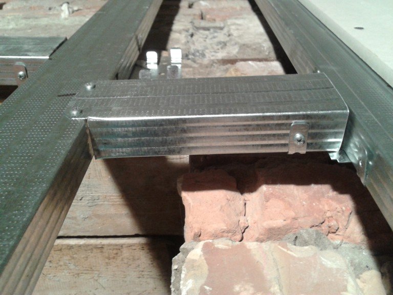 Instalación de perfiles horizontales (previamente en los lugares de "superposición" de perfiles horizontales a verticales, estas secciones se recortan). Fijación de perfiles horizontales.