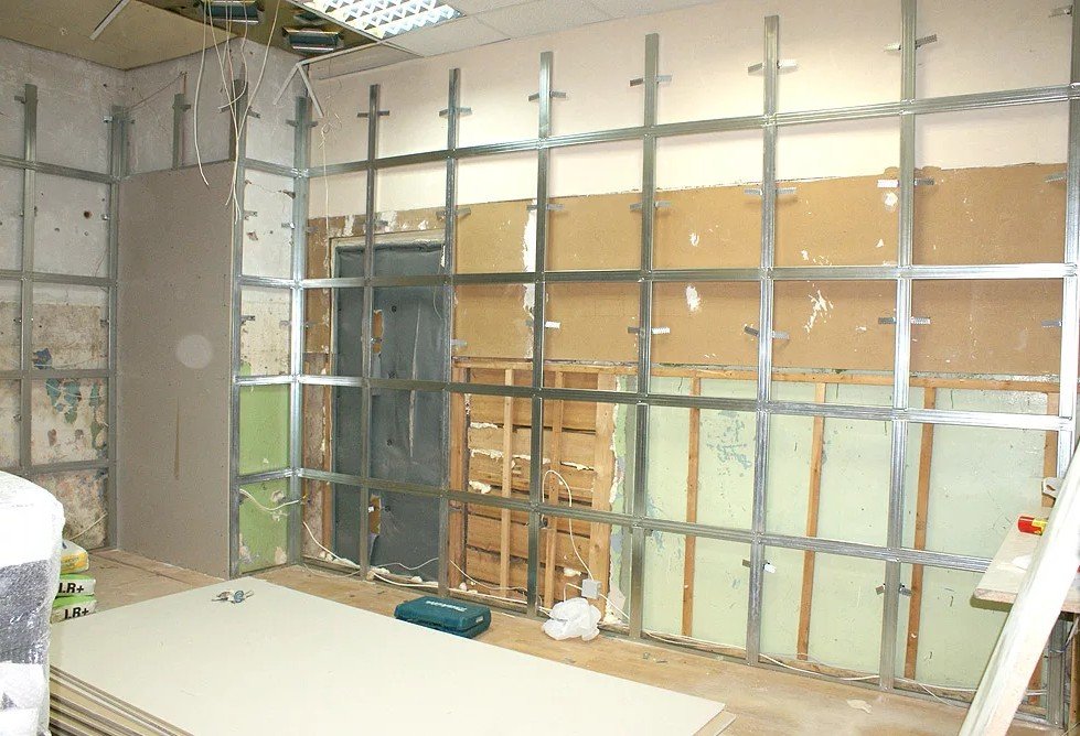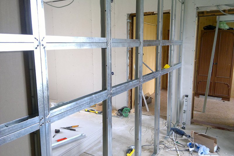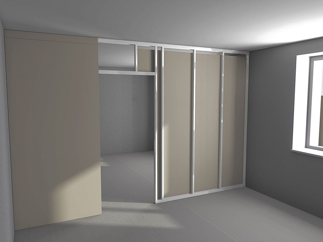 Las particiones de paneles de yeso se montan en el marco. Puede ser "simple" (que consta de solo dos rieles) o "voluminoso" (incluye un par de rieles paralelos en el techo y el piso). El segundo tipo es más complejo, pero le permite obtener una partición confiable y duradera. El trabajo de instalación del separador con un solo marco se lleva a cabo de acuerdo con el siguiente esquema: