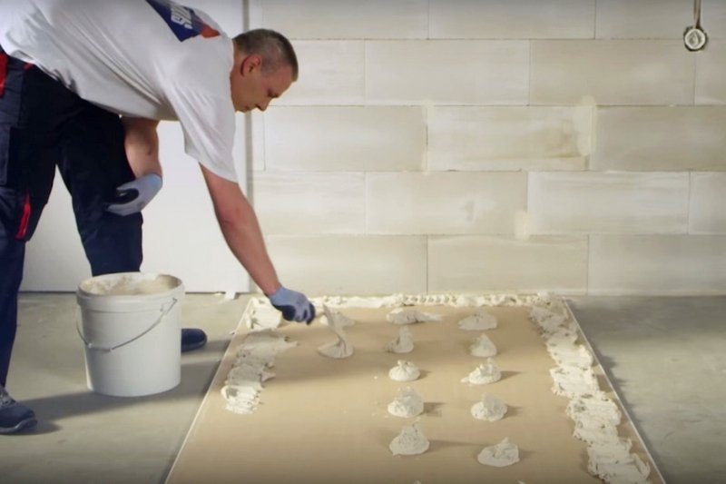 En caso de diferencias en la pared de no más de 5 mm alrededor del perímetro de la lámina, se aplica una masilla de yeso con una llana dentada. Además, se aplican dos tiras largas de composición adhesiva a una distancia de 40 cm de los bordes.