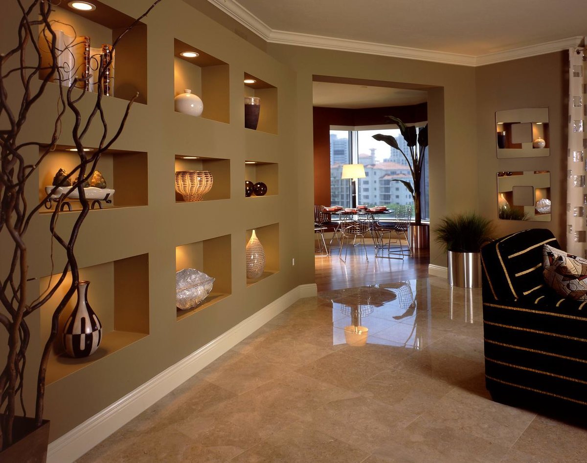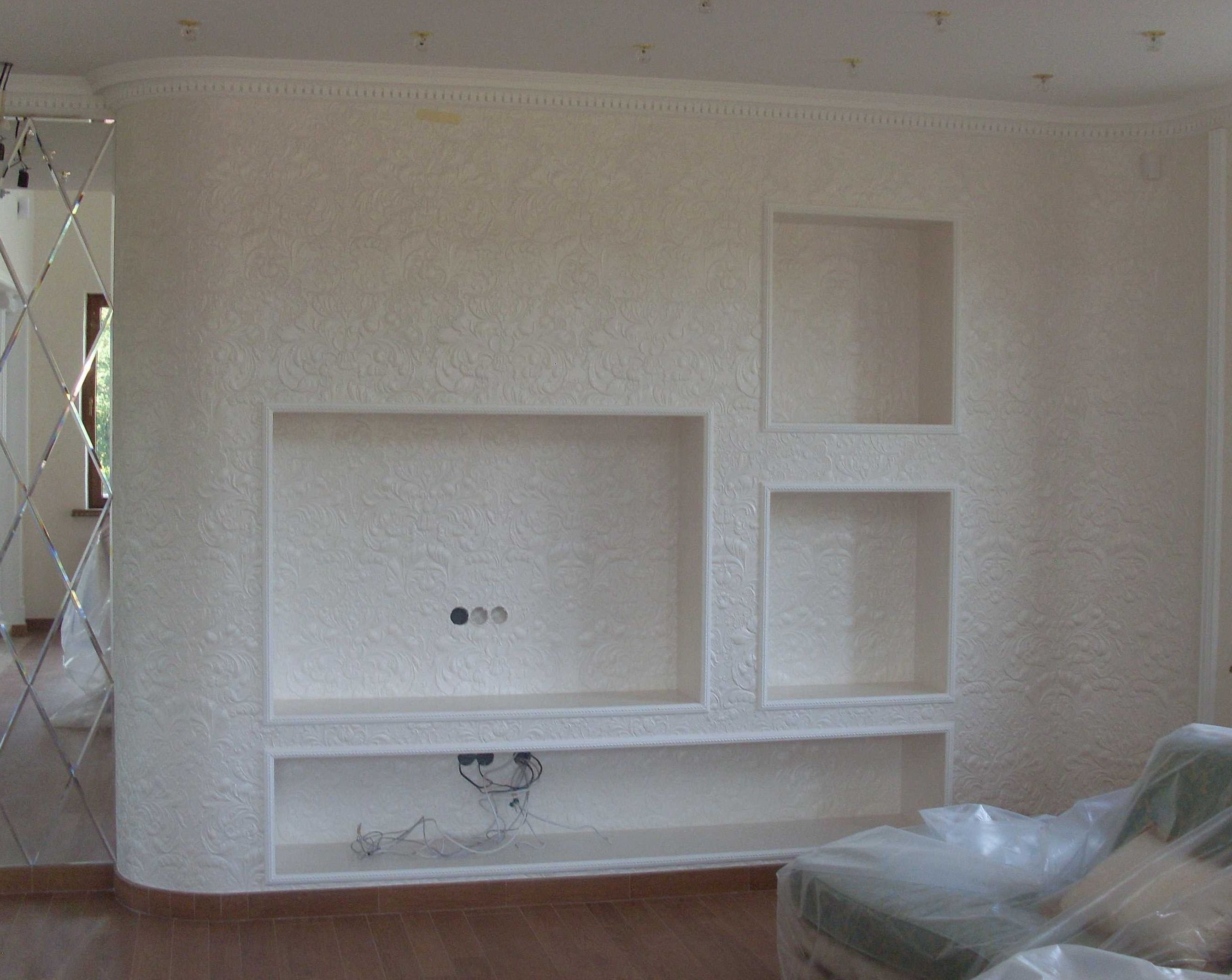 Hay muchas opciones para diseñar una habitación erigiendo un panel de yeso. La forma más común de estilizar es instalar un nicho. Se puede ubicar alrededor de la cabecera de la cama en el dormitorio o puede ser un "estante" de paneles de yeso de varios niveles. Para organizar dicho diseño, será necesario aumentar los niveles auxiliares. Además, se recomienda que cada nicho individual esté equipado con una luz de fondo.El diseño con la organización del segundo nivel arqueado de paneles de yeso en la parte superior de la pared parece muy inusual. El espacio dentro del nicho se puede pintar o pegar con papel tapiz fotográfico. Se puede considerar una forma simple de crear un diseño inusual resaltando las esquinas individuales de tal pared usando piedra artificial. En el panel de yeso en sí, sobre pintura, yeso decorativo o papel tapiz, puede arreglar una pequeña decoración de yeso o espuma. Los marcos ensamblados a partir de molduras de espuma se ven espectaculares. En el interior, puede pegar fondos de pantalla de otros colores o con otros patrones, pintar las paredes.