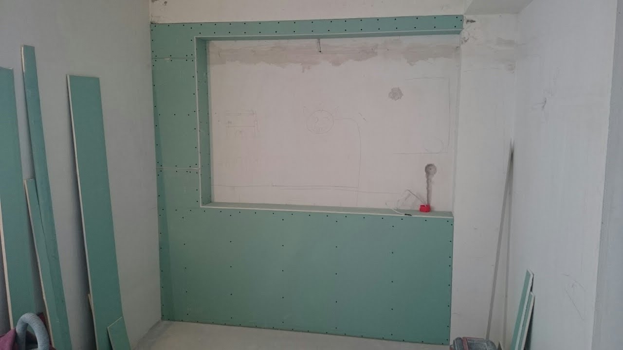 Paredes imprimadas para garantizar una buena adhesión del adhesivo en el panel de yeso a la pared limpia.