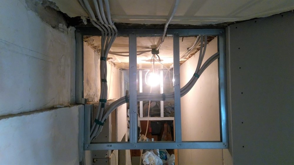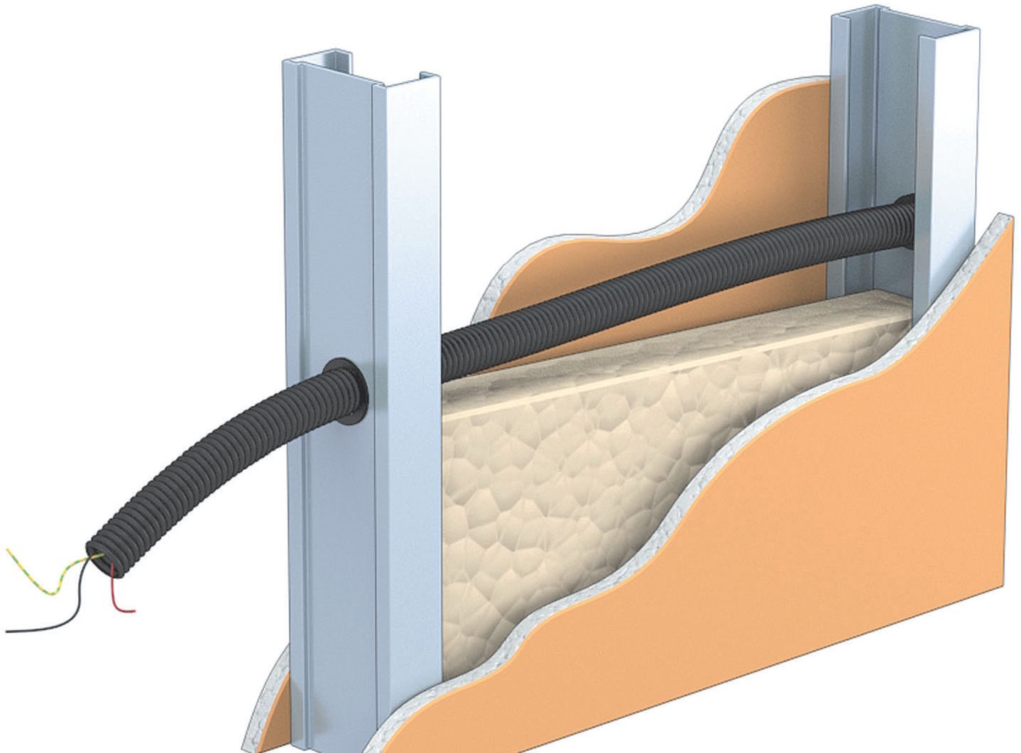 Si el cableado habitual de las tuberías (por ejemplo, en el baño) simplemente está cosido con paneles de yeso, se requerirá trabajo adicional para el cableado. Todos los cables se colocan en el corrugado. Esto creará un cableado seguro. A continuación, se determinan las ubicaciones de los puntos eléctricos (interruptor, enchufes). Los cables corrugados están conectados a estas secciones. En el panel de yeso en sí, debe hacer agujeros para los puntos eléctricos con la boquilla especial "corona". Para que el corrugado no cuelgue debajo del panel de yeso, es necesario arreglarlo con abrazaderas. Las abrazaderas de plástico generalmente se unen a las suspensiones.