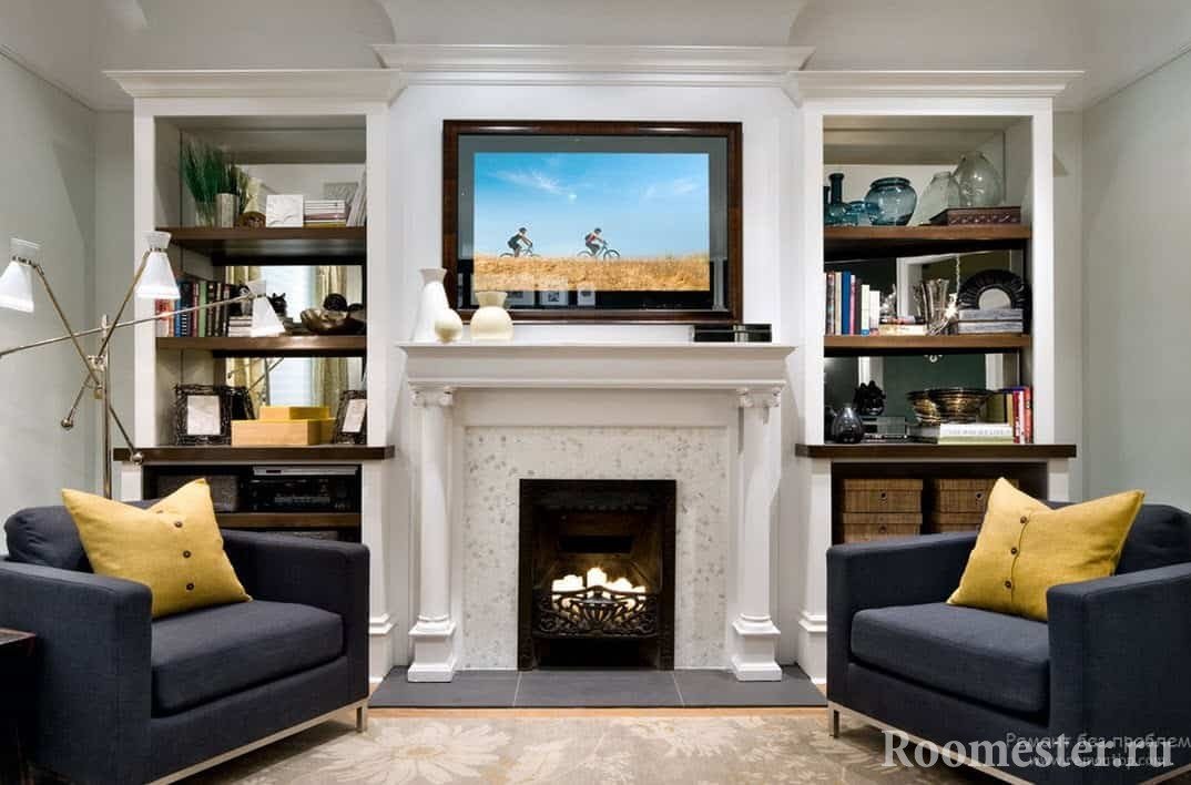 si el espacio lo permite, el televisor se coloca en la esquina opuesta de la chimenea;