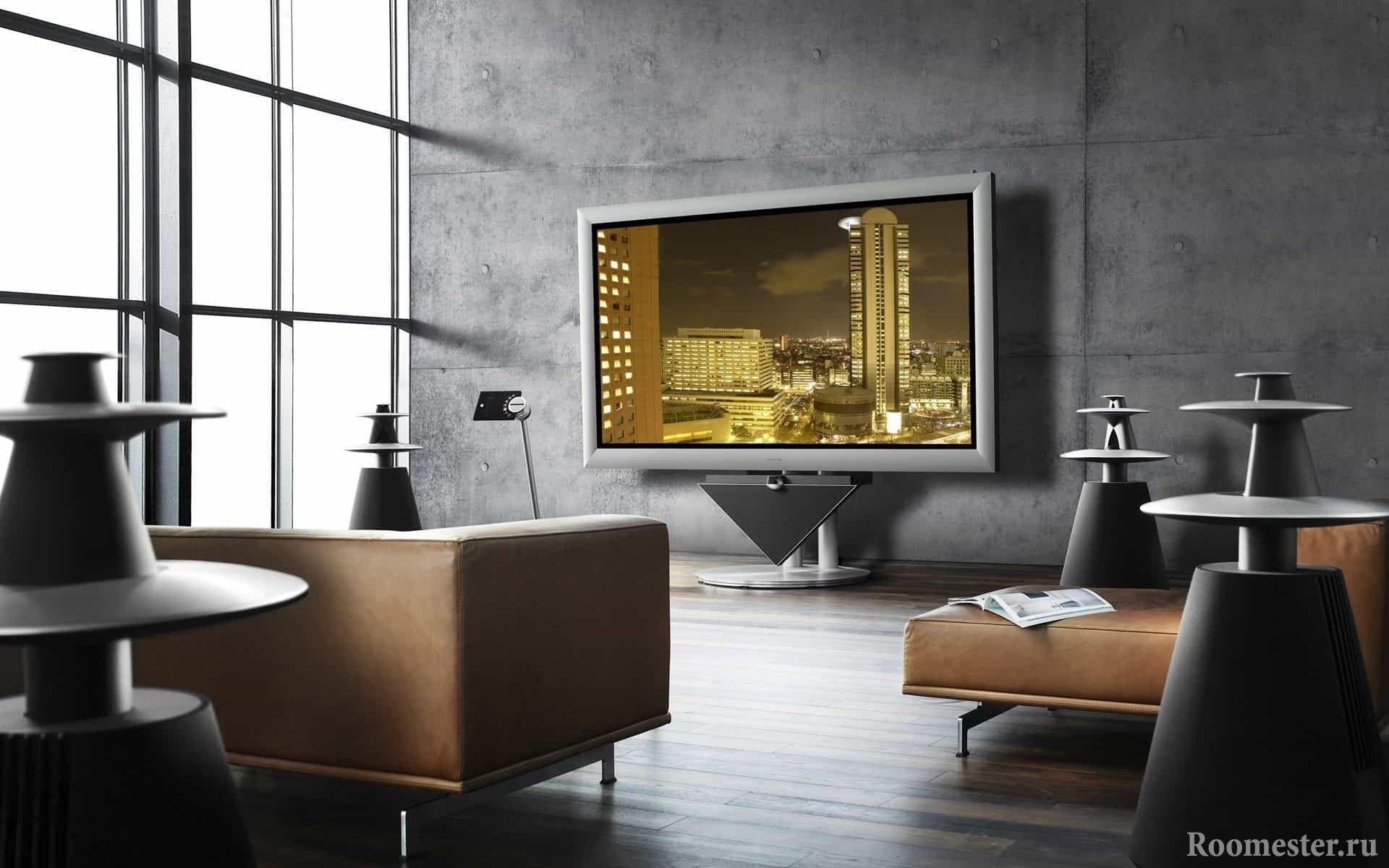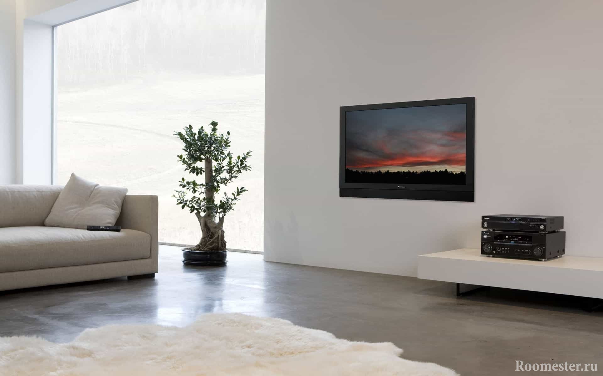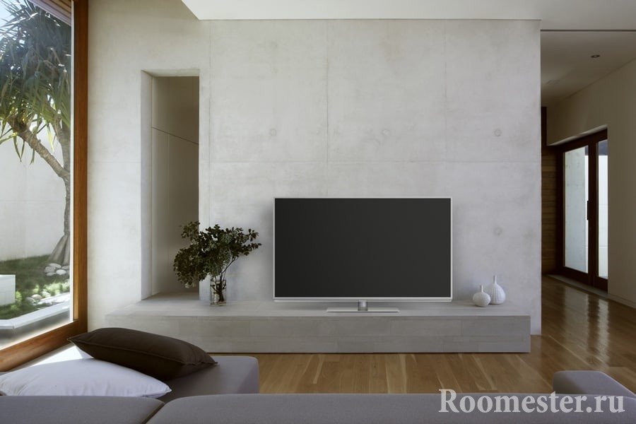 Si el plasma ligero y delgado que acaba de colgar en la pared, este es el caso cuando el dispositivo, en sí mismo, es el elemento principal de la decoración. Hay muchas opciones sobre cómo vencerlo y resaltarlo maravillosamente. Consideraremos lo más interesante.