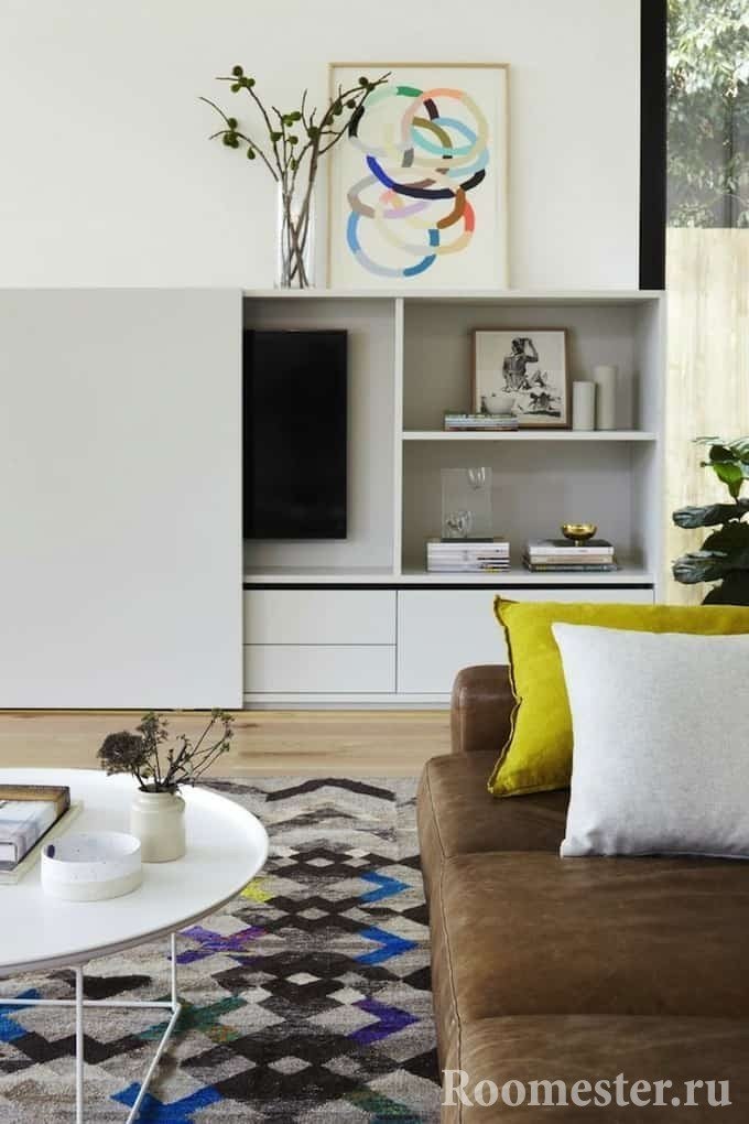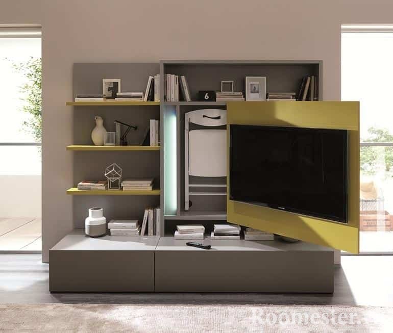 Estanterías Esta es una forma ultramoderna que enfatizará, o viceversa, ocultará la TV detrás de un panel deslizante. La estantería es una excelente opción para una sala de estar de alta tecnología o para aquellos a quienes les gusta el minimalismo en todo.