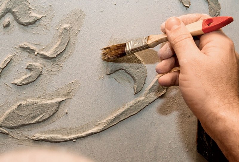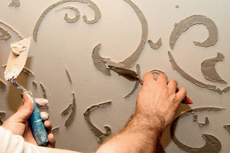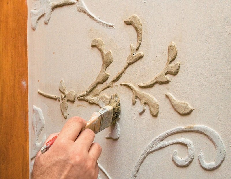 Para crear tal bajorrelieve, necesitará una plantilla con un grosor de uno a tres milímetros, una masilla hecha de acrílico especial, que se aplica capa por capa con una espátula. La plantilla se retira cuando la composición acaba de agarrar, pero aún no se ha congelado por completo. Si hay irregularidades notables, se pulen con papel de lija, luego se pintan, esperan hasta que se sequen por completo.