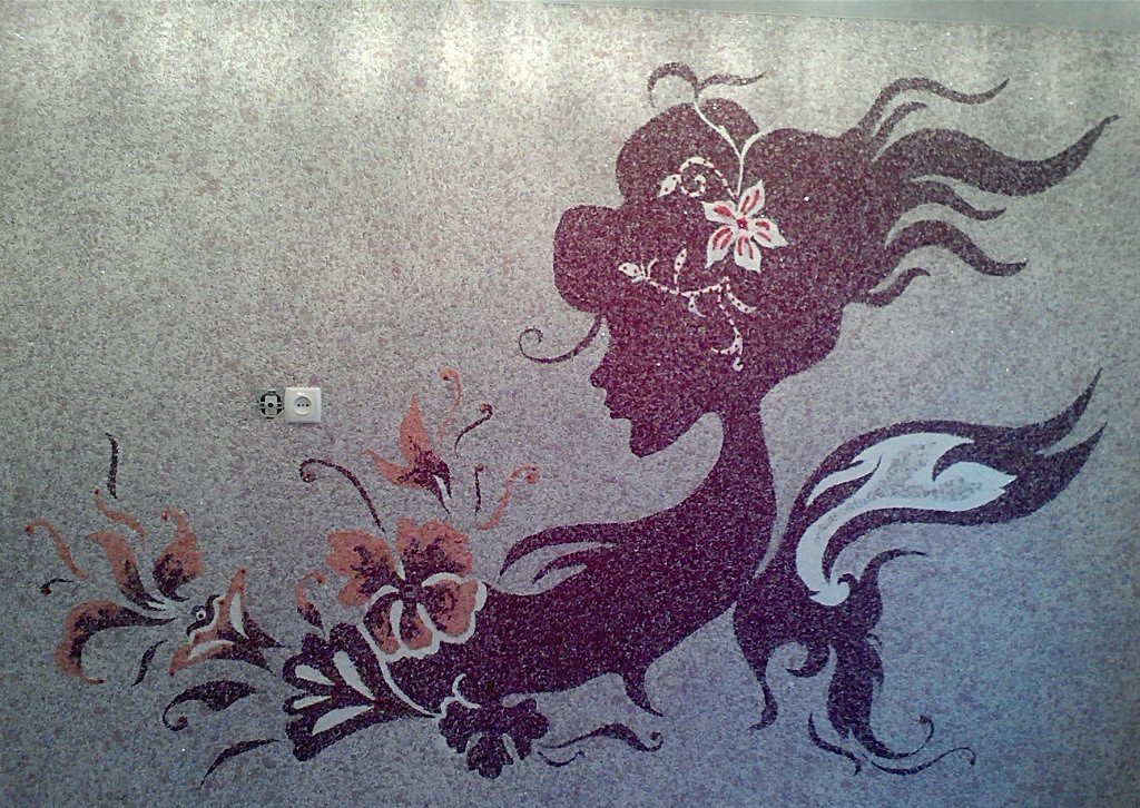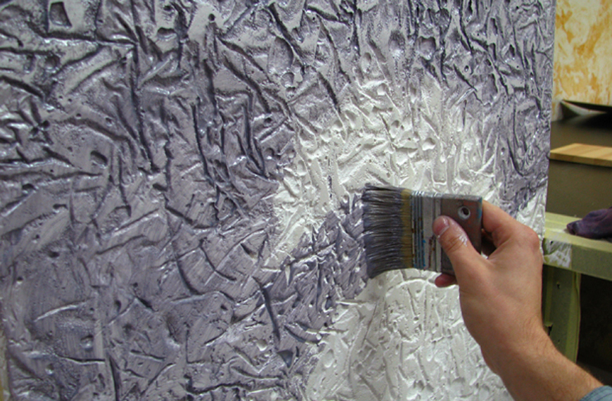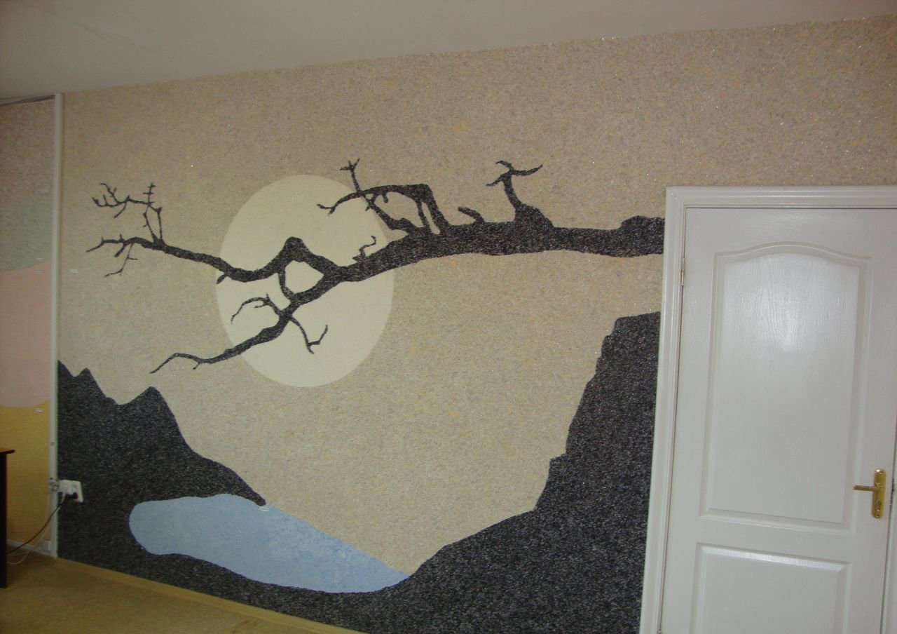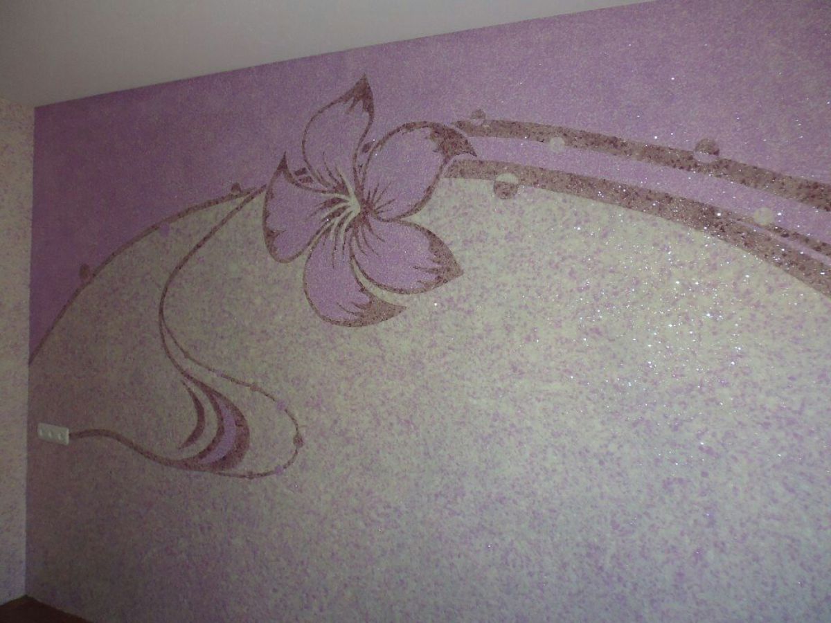 El dibujo se lleva a cabo de varias maneras. Se elige un método adecuado en función de las características de la base y su nivel de adhesión. En el revestimiento terminado, los patrones se crean con pinturas especiales después de que se haya secado por completo. Si tiene problemas con las habilidades artísticas, use una plantilla. Se aplican en el lugar correcto y se rellenan con papel tapiz líquido de un cierto tono. De esta manera, se puede obtener un patrón voluminoso y llamativo.