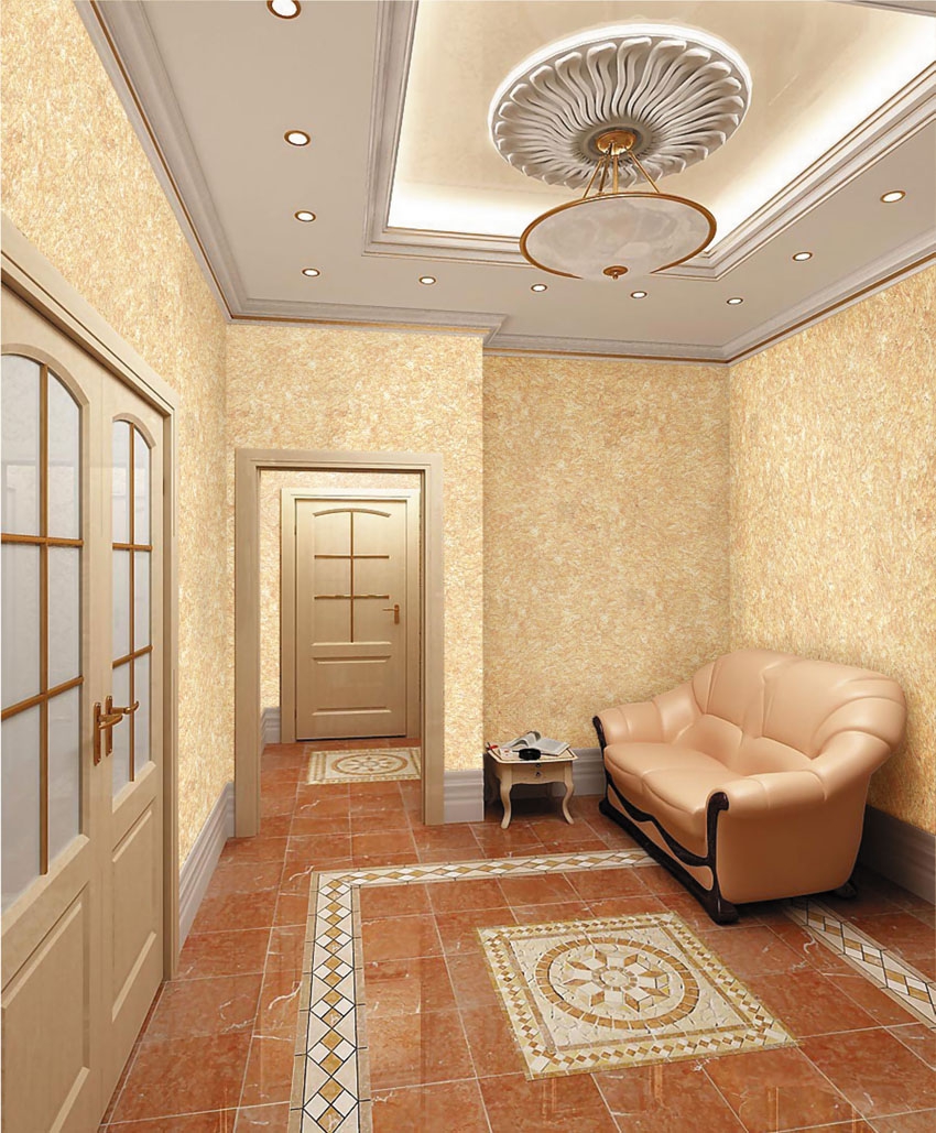 La superficie lisa del fondo de pantalla líquido le permite imponer una piedra decorativa en forma de fragmentos de roca y elementos de ladrillo liso. Esta combinación es adecuada para pasillos, protegiendo el fondo y las esquinas de las paredes de la contaminación.