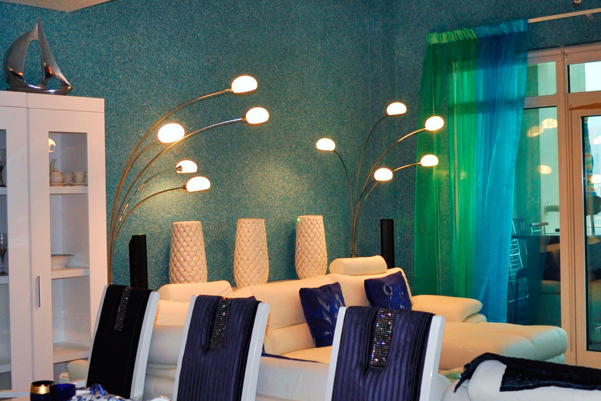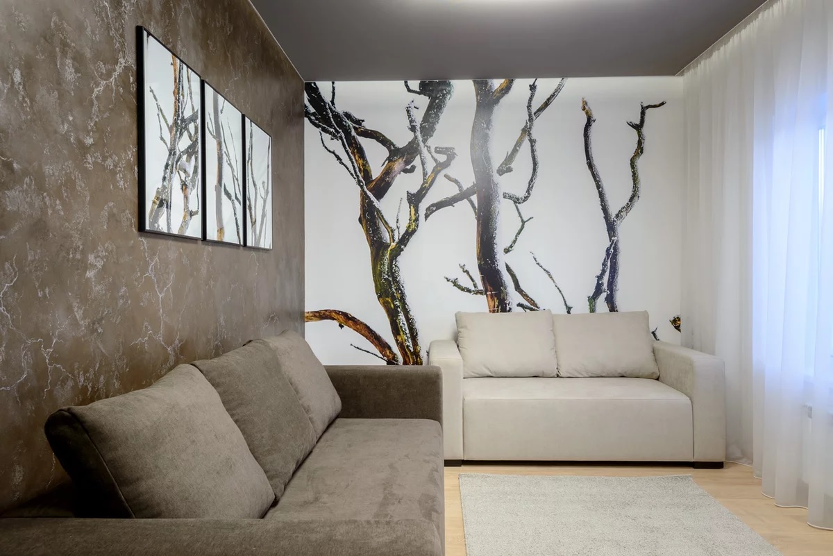 Usando una combinación de diferentes tipos de papel tapiz líquido, puede realizar la zonificación de la sala.