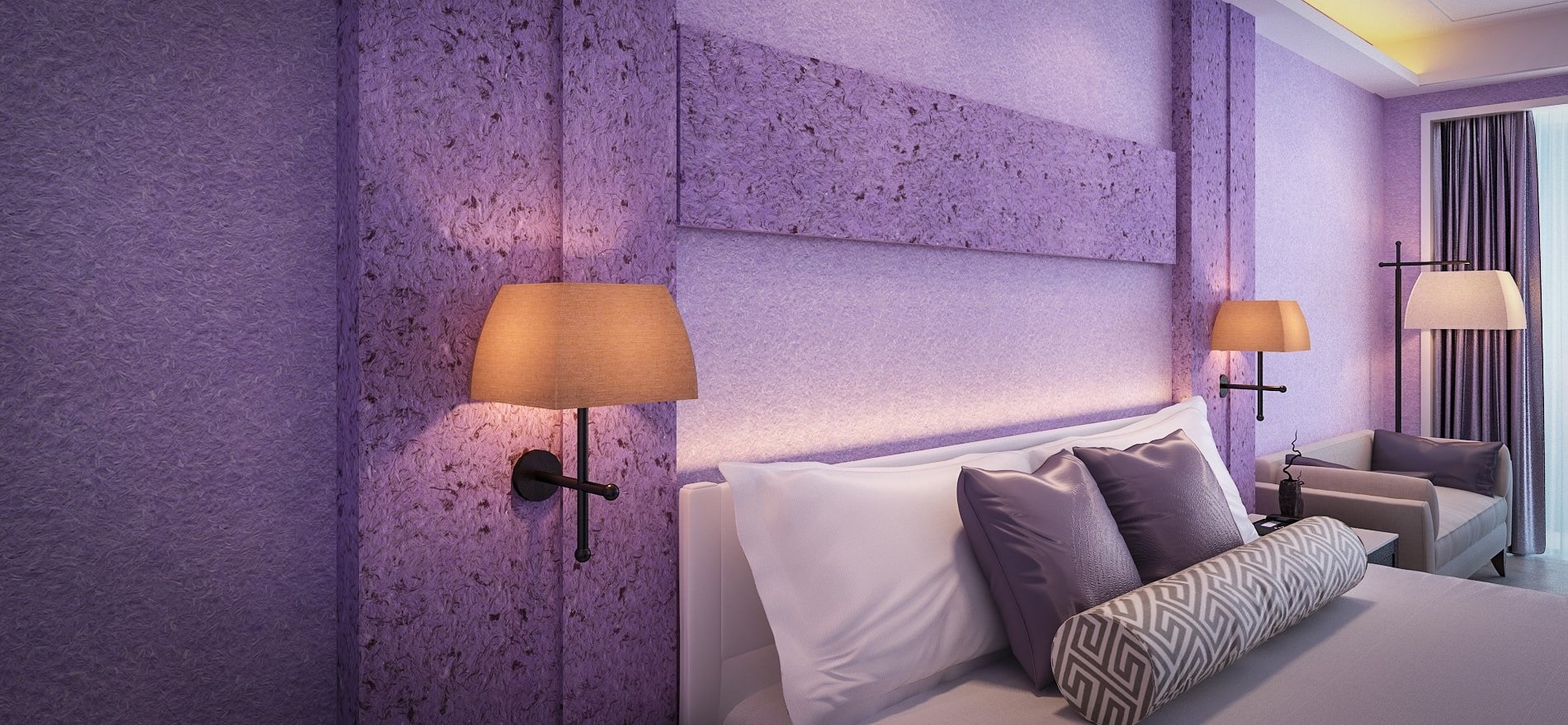 Se debe prestar especial atención a la paleta de colores.Y aunque cada persona tiene sus propias preferencias, no debe usar colores agresivos, exagere con tonos oscuros. Por ejemplo, un tono púrpura puede aumentar la ansiedad, causar depresión, rojo - agitación excesiva, conducir a la falta de sueño. Los especialistas recomiendan que se apliquen dibujos grandes a la pared decorativa.