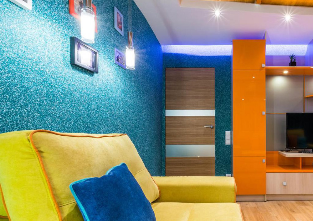 El salón carece de las deficiencias de la cocina, por lo que el papel tapiz líquido puede convertirse en uno de los mejores tipos de decoración. El material creará un interior único. Debido a la gran variedad de especies, puede elegir fácilmente cualquier estilo, hacer el esquema de color apropiado. Lo principal es diseñar adecuadamente, no ir demasiado lejos con detalles y sombras. Para hacer esto, siga los consejos de diseñadores profesionales: