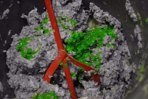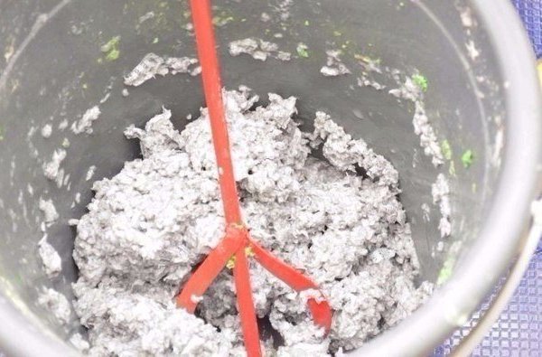 En un recipiente o balde recogemos agua tibia, vertimos la pulpa de papel triturada, mezclamos, dejamos que la mezcla se hinche durante un par de horas.