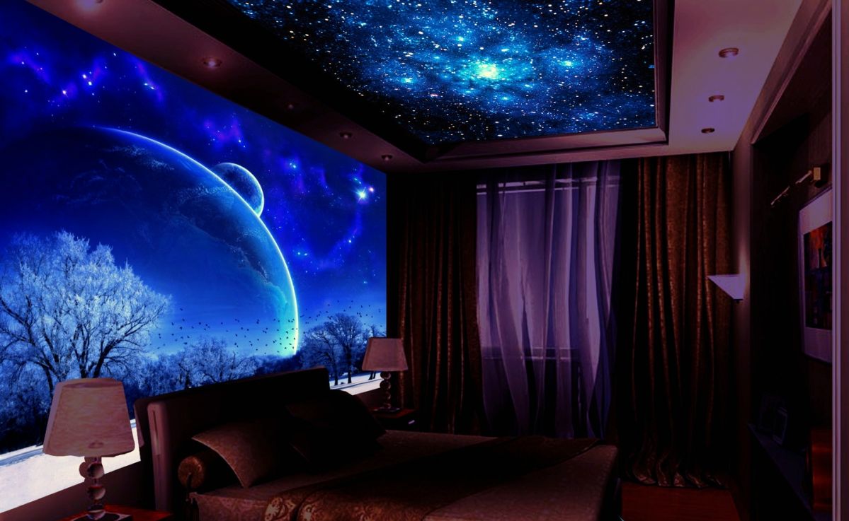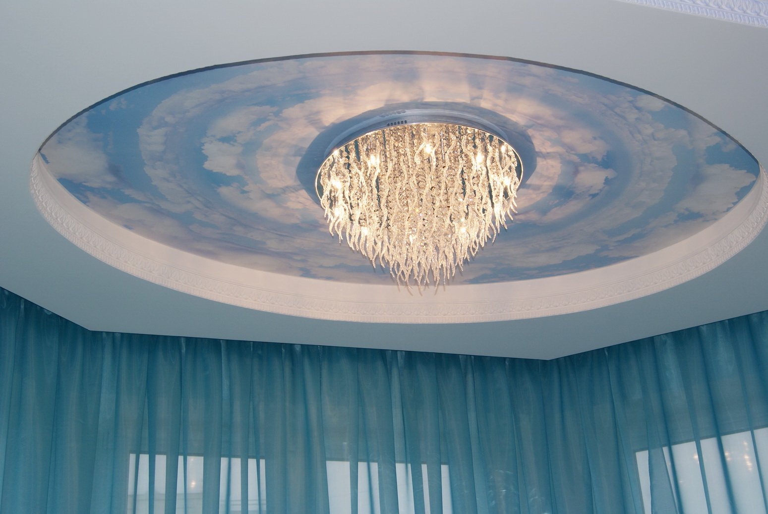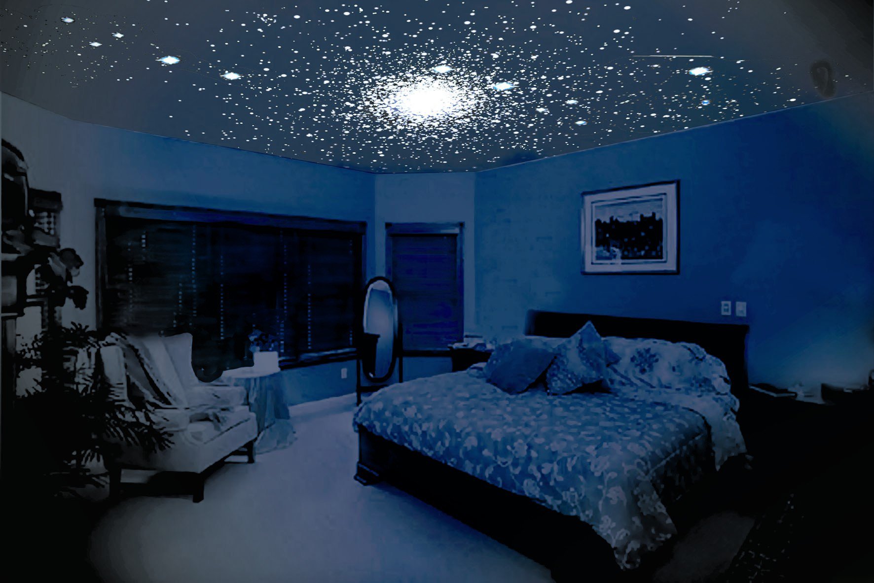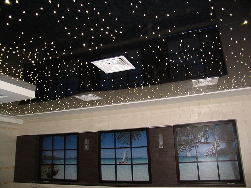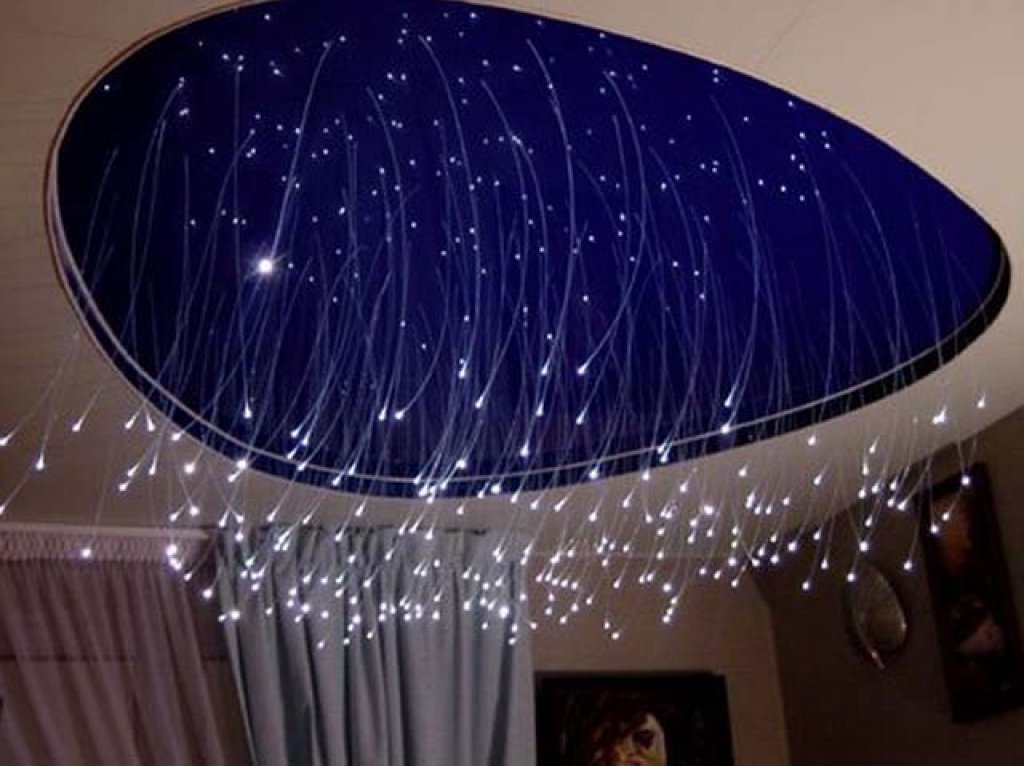 Un techo tensado hecho de película de PVC es el más adecuado para la instalación de hilos de fibra óptica.Es más fácil aplicar un dibujo, una capa decorativa sobre él. En una superficie de tela, es mucho más fácil hacer marcas para resaltar los elementos ópticos. Utilizando la impresión interior, los lienzos de satén mate están decorados con pinturas del cielo estrellado, dunas de arena, auroras boreales, estrellas fugaces, un desfile de planetas y otros.