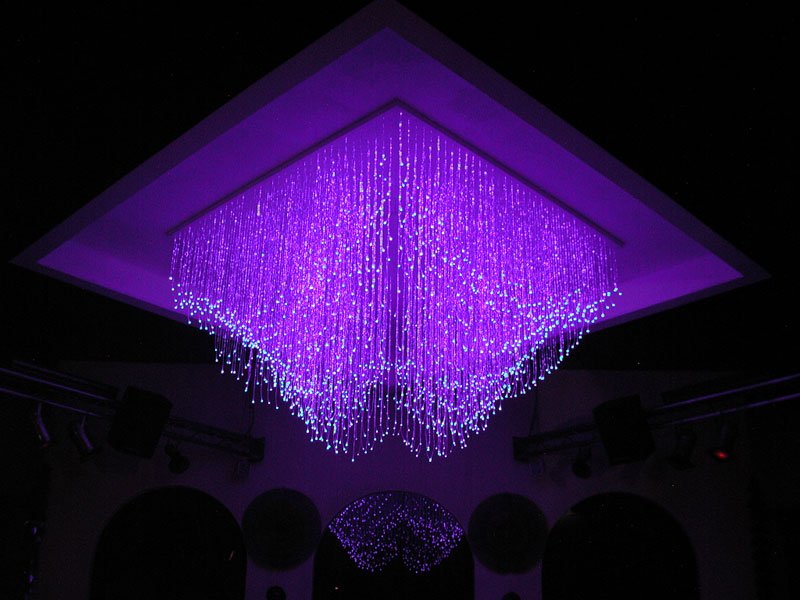 El funcionamiento de la luz de fondo de fibra óptica se realiza mediante un generador de luz. Al colocar los hilos en la estructura de tensión, puede lograr la imagen de cualquier imagen luminosa con áreas de diferente brillo. Pueden ocultarse debajo de la materia o sacarse.