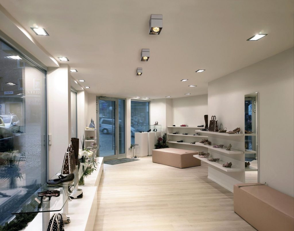 Punto. La mejor opción que se puede aplicar en cualquier altura de techo. La cantidad de dispositivos se calcula en función del área de la habitación, un elemento puede iluminar hasta 2 m2. Se pueden usar como fuente de luz primaria y como fuente auxiliar.