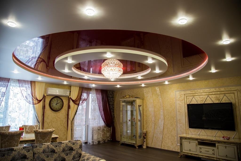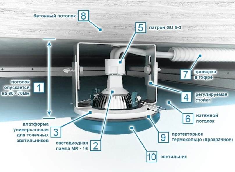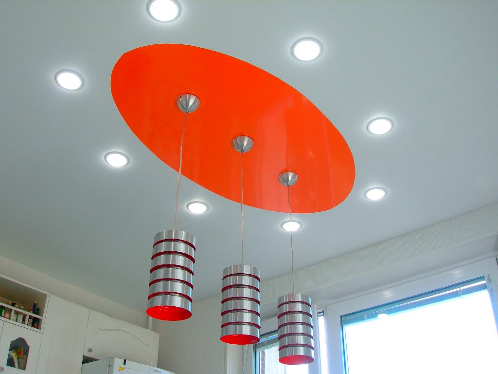 Cada tipo de producto de iluminación tiene sus propias dimensiones, de las cuales depende el peso de toda la estructura. Ideal para falsos techos son focos. Son ligeros, no crean una gran carga en el lienzo, lo que no conduce a la flacidez.