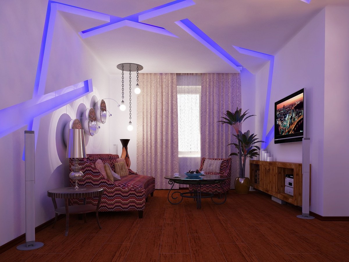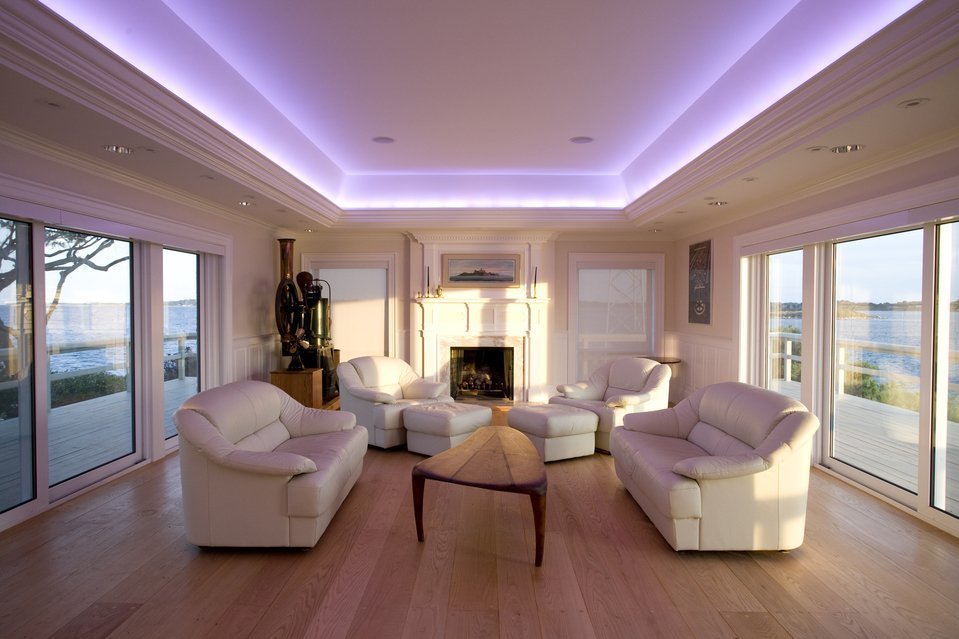 La tira de LED en las habitaciones puede verse diferente.La piedra en el interior de la sala de estar está decorada con diodos perfectamente, ya que junto a ella, por lo general, hay una chimenea, que es una fuente adicional de luz. Puede seleccionar una ventana con diodos, el énfasis está en cortinas, puertas delanteras y dibujos en el piso. El énfasis es una buena manera de zonificar su hogar.