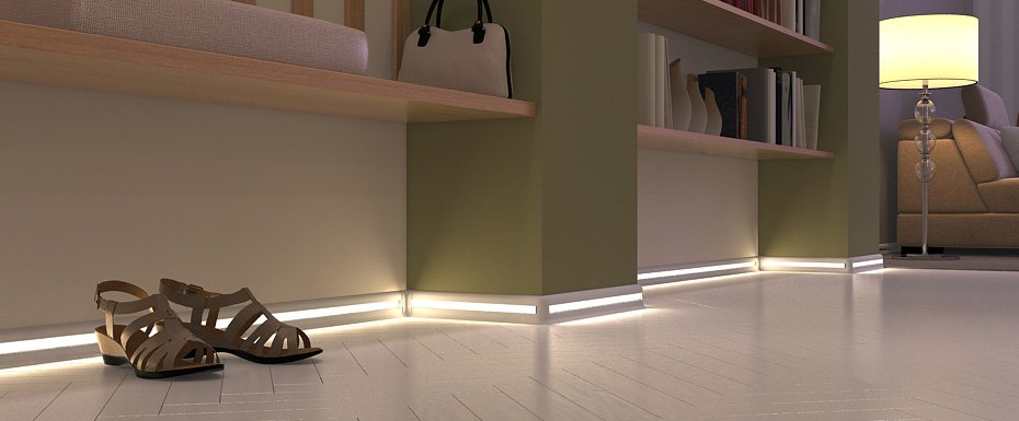 Un zócalo de madera ordinario no es adecuado para aplicaciones de iluminación. La tira de LED se puede utilizar en zócalos especiales con canales de cable. Después de colocar la cinta en el canal en el zócalo, se colocan tapas difusoras especiales, que también protegen la estructura del polvo y la suciedad. Estos enchufes ayudan a difundir la luz brillante de los LED.