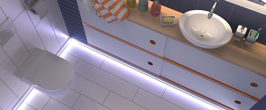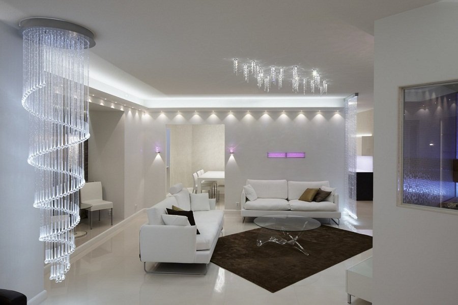 En el baño, la cinta con diodos se combina con accesorios del tipo "hielo". Con esta técnica, una habitación pequeña recibe suficiente luz. En la sala de estar, todo depende del concepto general del interior.