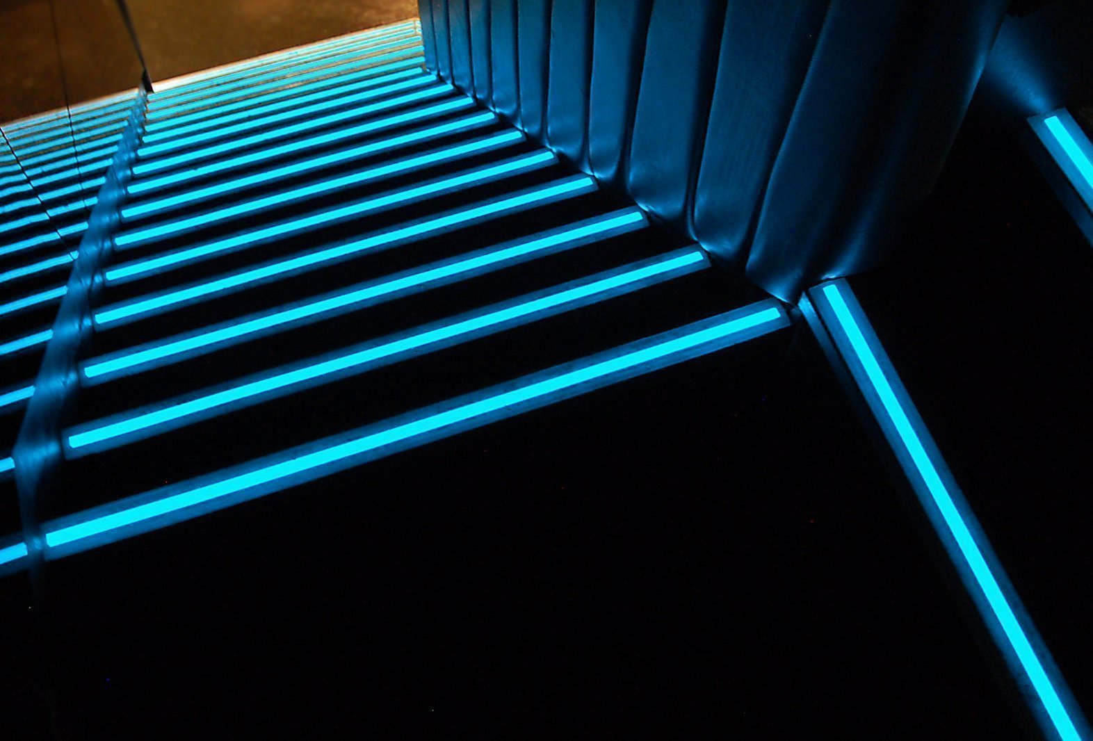 La cinta se coloca en el centro de los tramos y escalones, crea un contorno lateral a partir de ella. O solicite cada paso por separado.A veces, en el centro de las escaleras, los LED, como en una pista de carreras, se colocan paralelos entre sí.