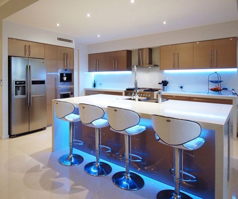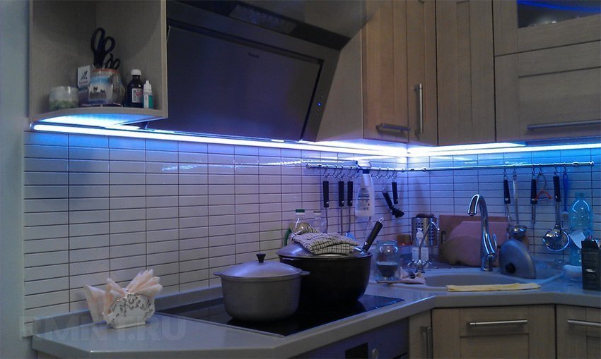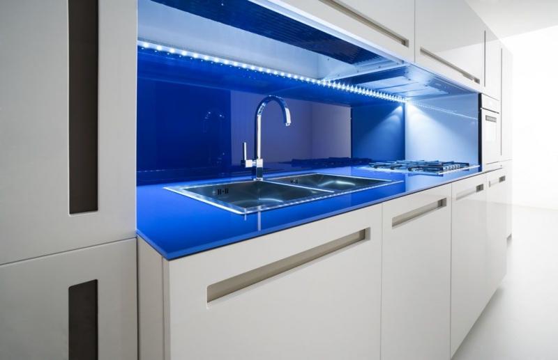 La ubicación principal de la luz de fondo en la cocina es el área de trabajo de la mesa. Cuando cocinamos, a menudo no tenemos suficiente iluminación superior y lateral. Los LED en la zona correcta resuelven este problema.
