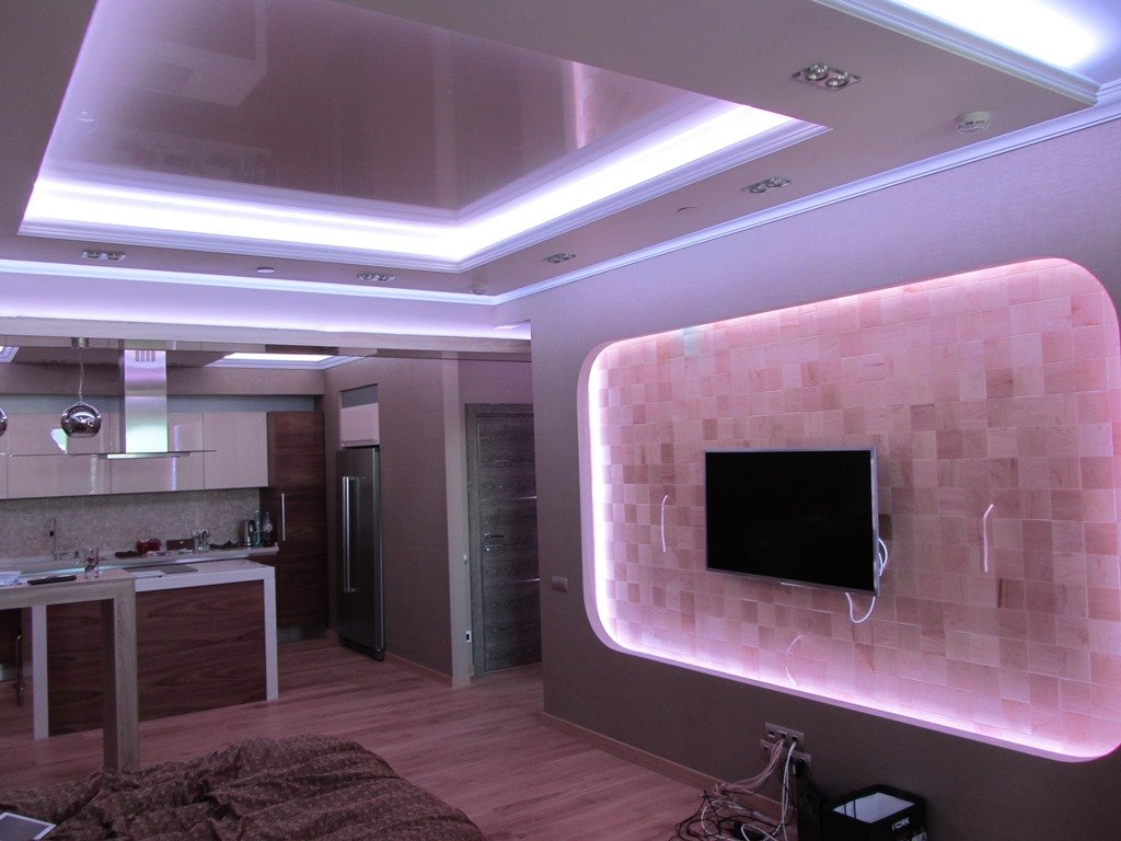 La iluminación de diseño en el lienzo del techo no está diseñada para dar mucha luz a la habitación. Su tarea es hacer que la atmósfera del hogar sea cómoda e inusual. Los LED son una fuente de luz adicional que no reemplaza a la principal.