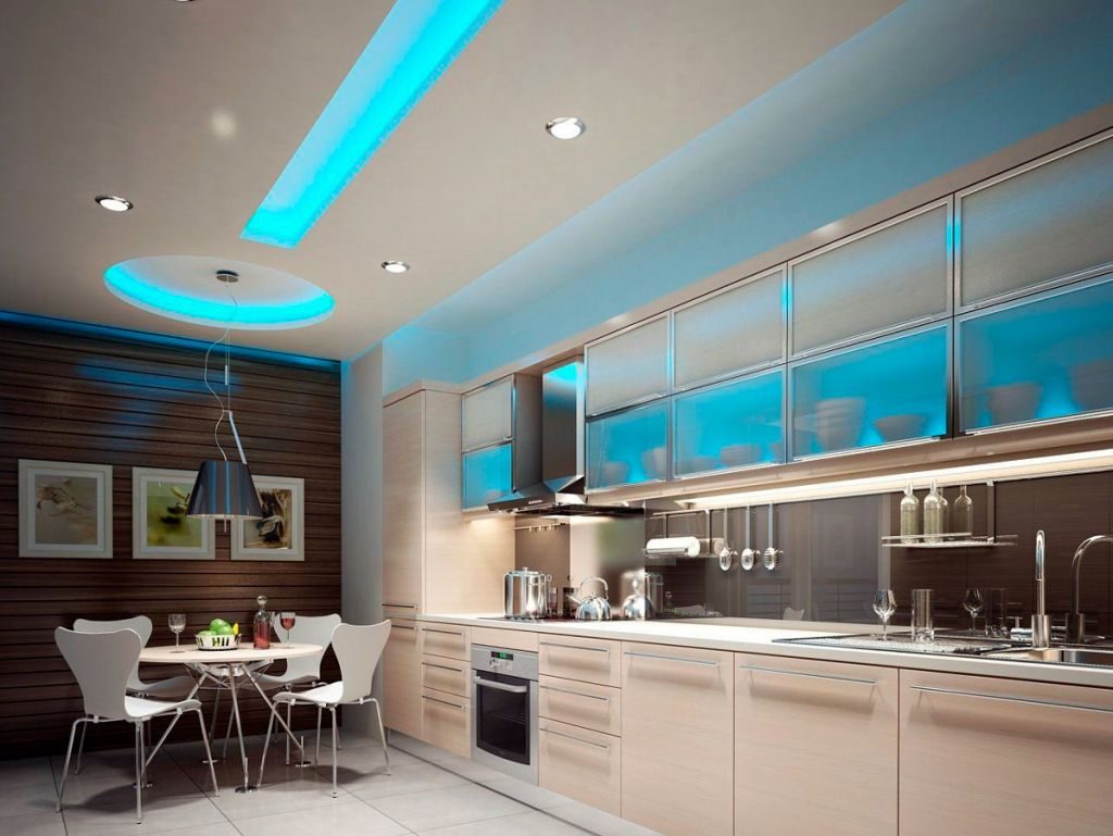 La ubicación principal de la luz de fondo en la cocina es el área de trabajo de la mesa. Cuando cocinamos, a menudo no tenemos suficiente iluminación superior y lateral. Los LED en la zona correcta resuelven este problema. Un movimiento de diseño excelente es la iluminación interior de los gabinetes acristalados. La parte inferior del juego de cocina también se puede decorar con LED.