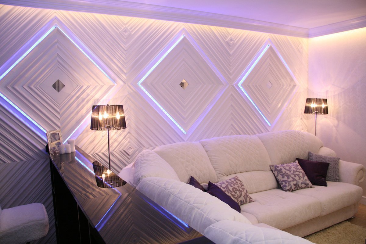 La iluminación expresiva del zócalo le da a la habitación un aspecto festivo. Para controlar la intensidad de la luz, se instala un controlador separado. Y luego la atmósfera en la habitación se puede cambiar a voluntad.