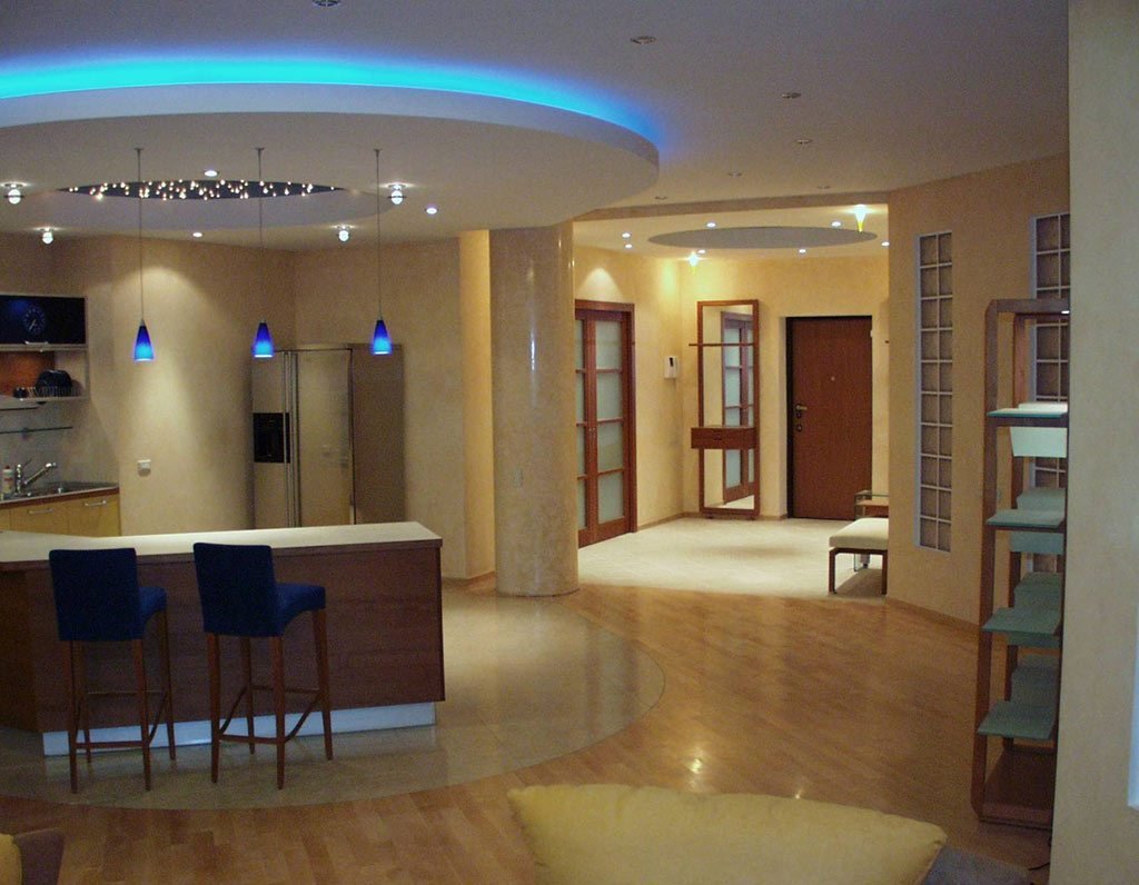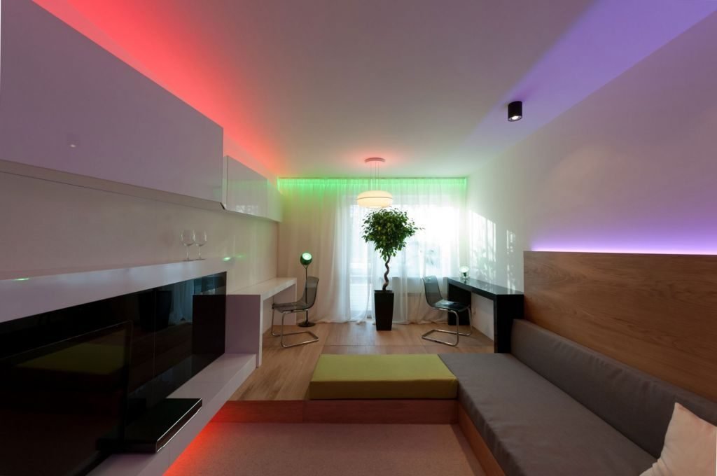 En el apartamento, la tira de LED se utilizó originalmente en el techo. Los diseñadores crearon a partir de ella una imagen del cielo estrellado. Después de eso, los LED comenzaron a usarse para decorar las paredes.Los mosaicos y adornos de diodos se veían mejor en el dormitorio y la guardería.