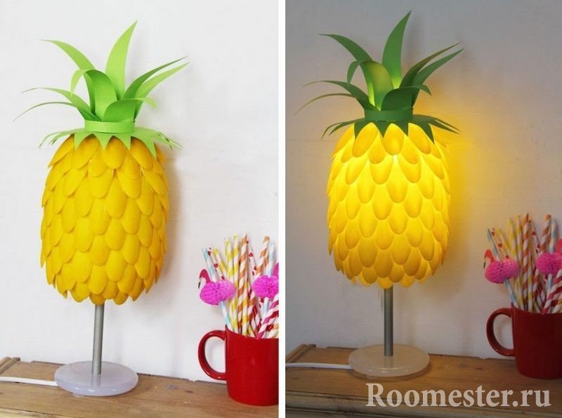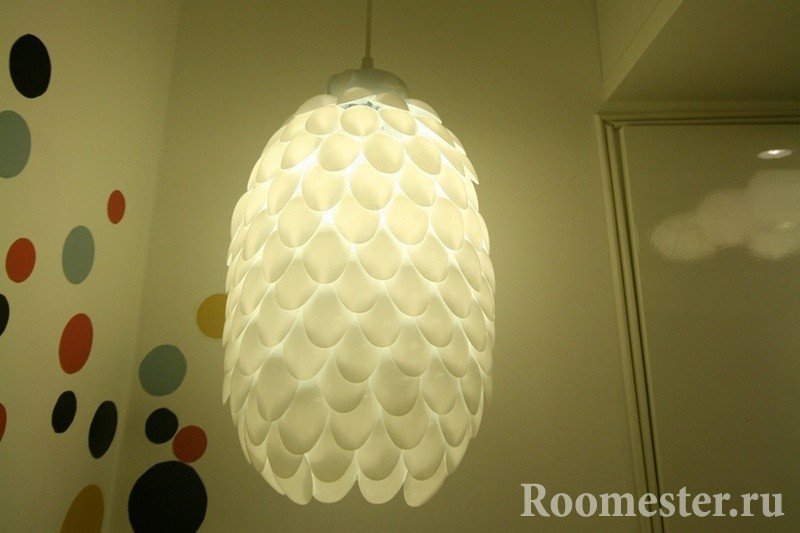 Primero debes cortar el soporte de todas las cucharas. Cada producto debe dejar 0,5 cm de bote para el anclaje. A continuación, las partes de la cuchara se unen aleatoriamente al marco. Pueden superponerse, imitando escamas de peces o ir al azar, pareciéndose a pétalos de rosa. Las patas de la cuchara también se pueden usar para decorar. Después de cubrir toda la superficie del marco, la superficie de la cuchara se cubre con pintura acrílica, lisa o multicolor. Con esta técnica de decoración, puede crear una lámpara en forma de piña, flor, pez dorado y otros. Una pantalla hecha de cucharas de plástico es adecuada no solo para una lámpara de techo, sino también para decorar una lámpara de noche en una habitación infantil.