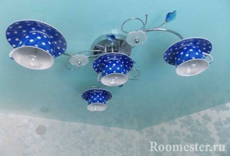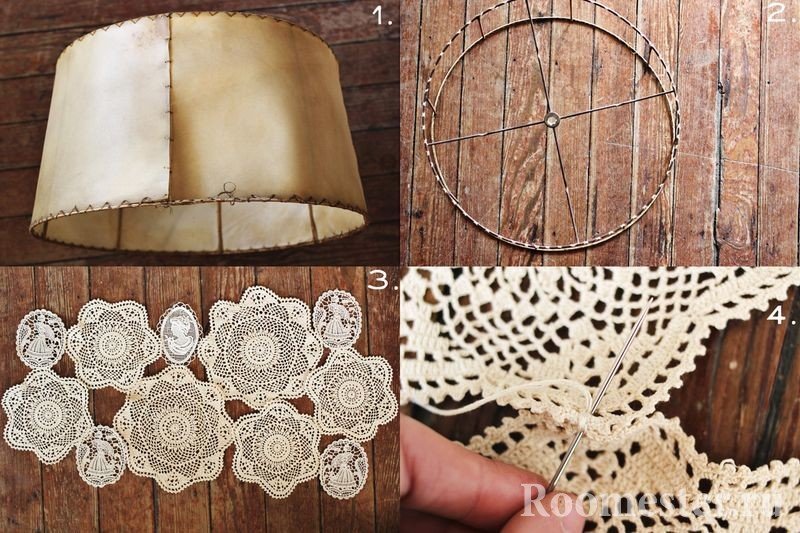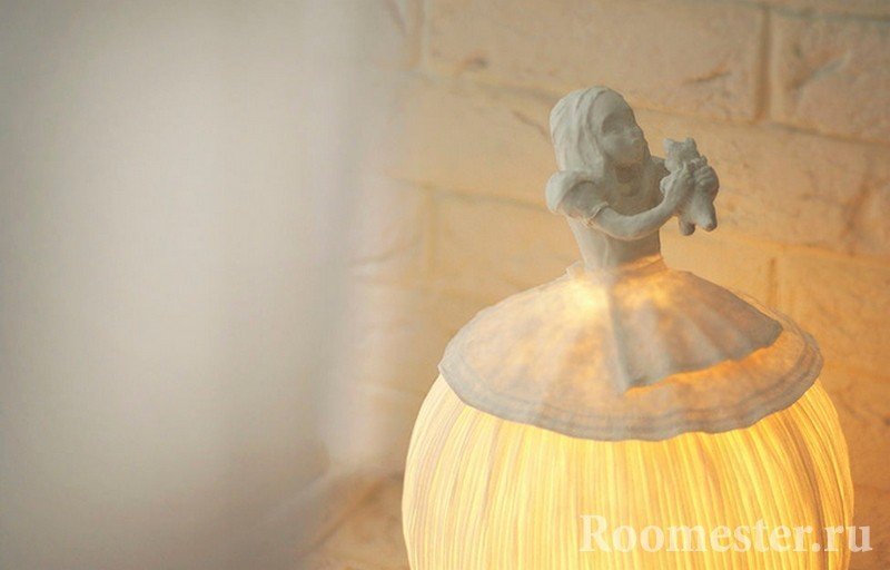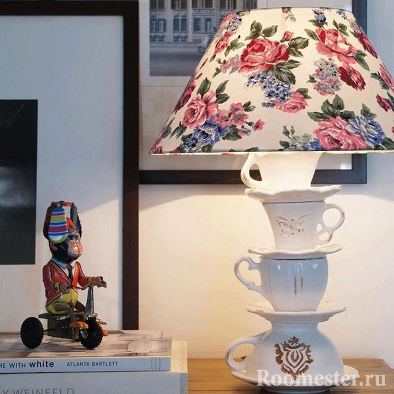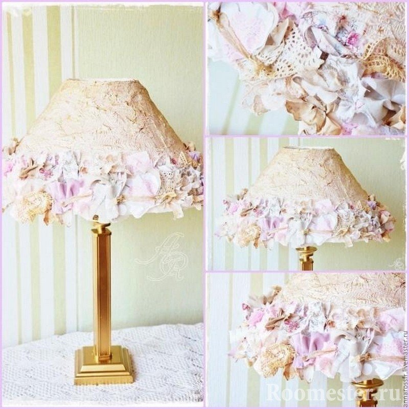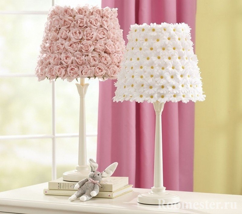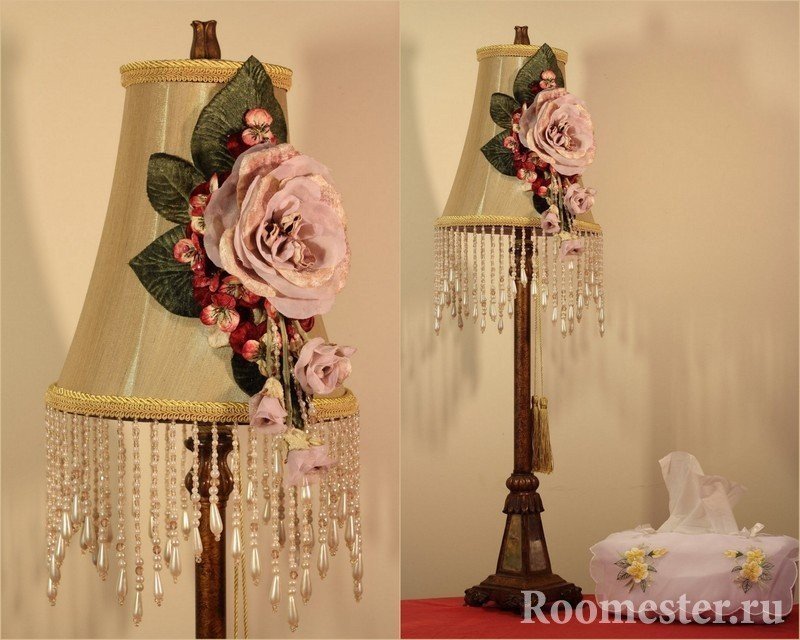 Si es necesario decorar la pantalla de la lámpara terminada para que coincida con el interior, se pueden cortar varias figuras de la tela, que se unen a la pantalla de la lámpara con una pistola de pegamento.