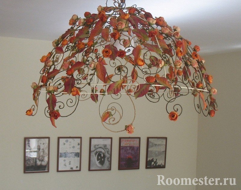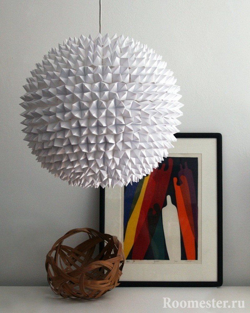 Antes de comenzar a trabajar, como con la pantalla de papel maché, debe inflar un globo del tamaño correcto. Será él quien servirá como una forma para el producto futuro. El hilo debe empaparse en una pasta y enrollarse en una bola en orden aleatorio. Los bordes libres de la cuerda están conectados, y el nudo debe ubicarse en la parte superior de la bola, donde se ubicará la cámara. El producto se secará en unos 2-3 días. Luego debe reventar la bola y puede conectar la cámara y la bombilla. El producto terminado se puede decorar con cuentas grandes, flores secas. Para decorar la glorieta, puede usar varias pantallas de diferentes tamaños.