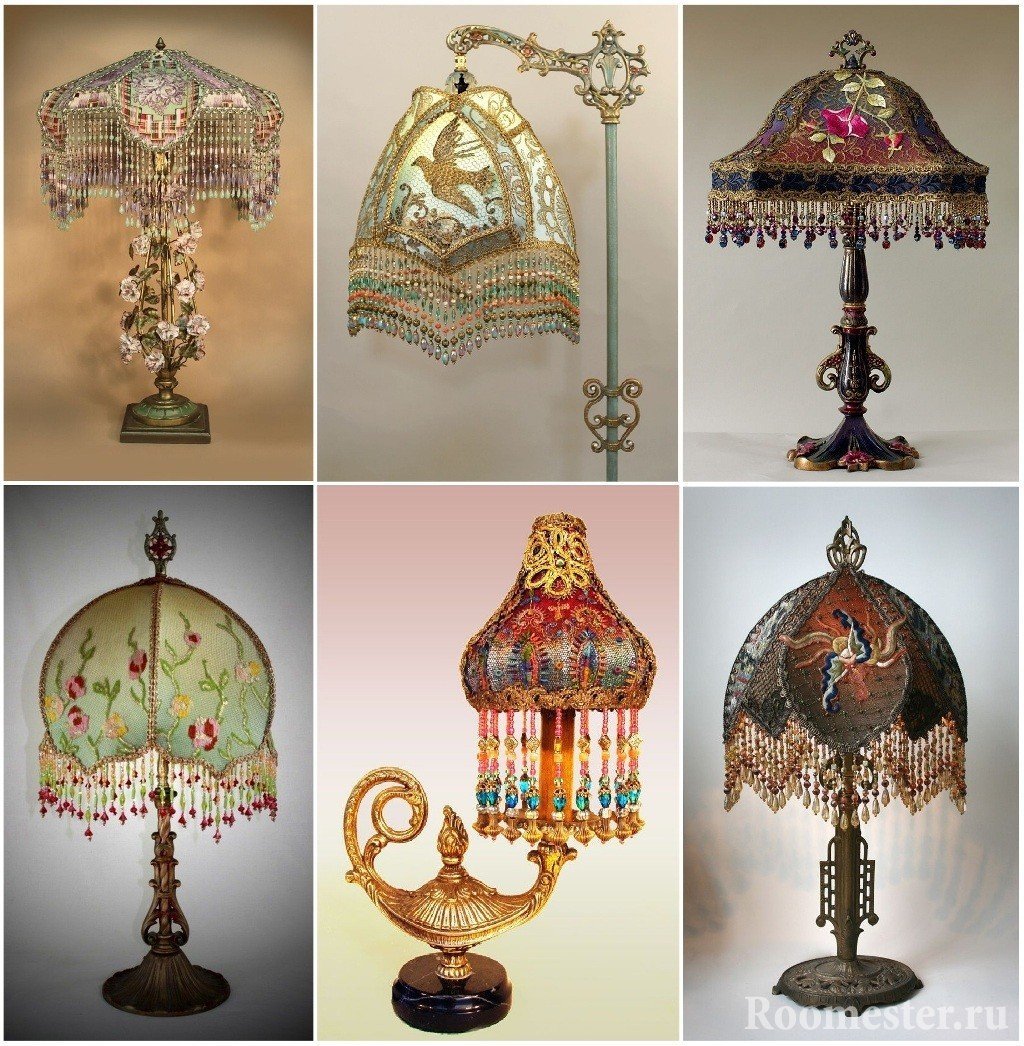 Una versión más compleja de la pantalla de tela se puede decorar con volantes, cintas de tejido. Las pantallas adornadas con cintas de tela o bordadas con cuentas y lentejuelas se ven bastante originales.