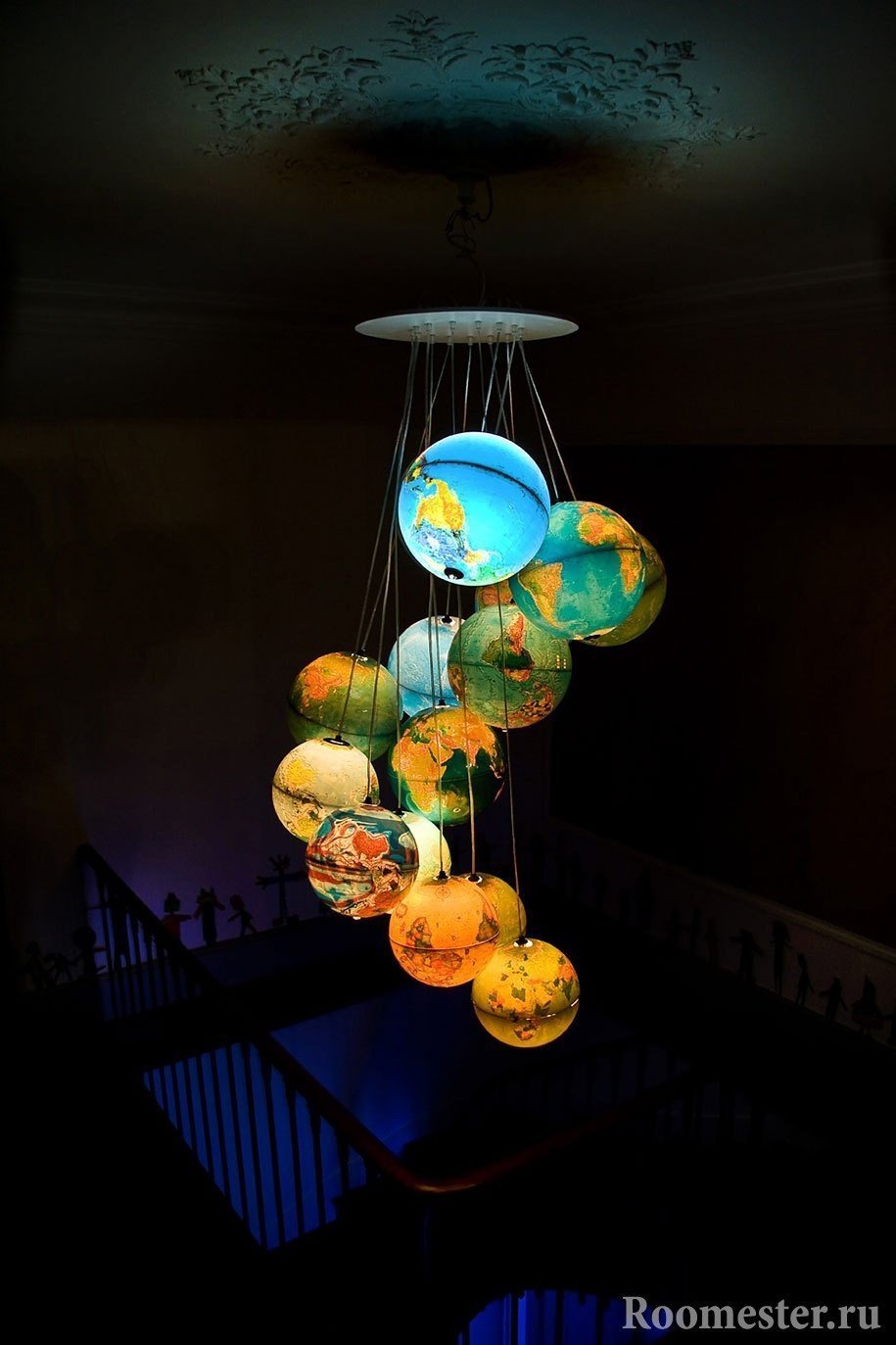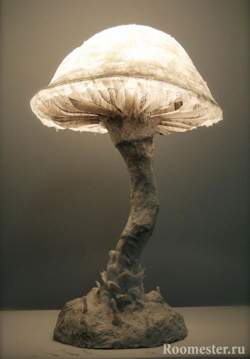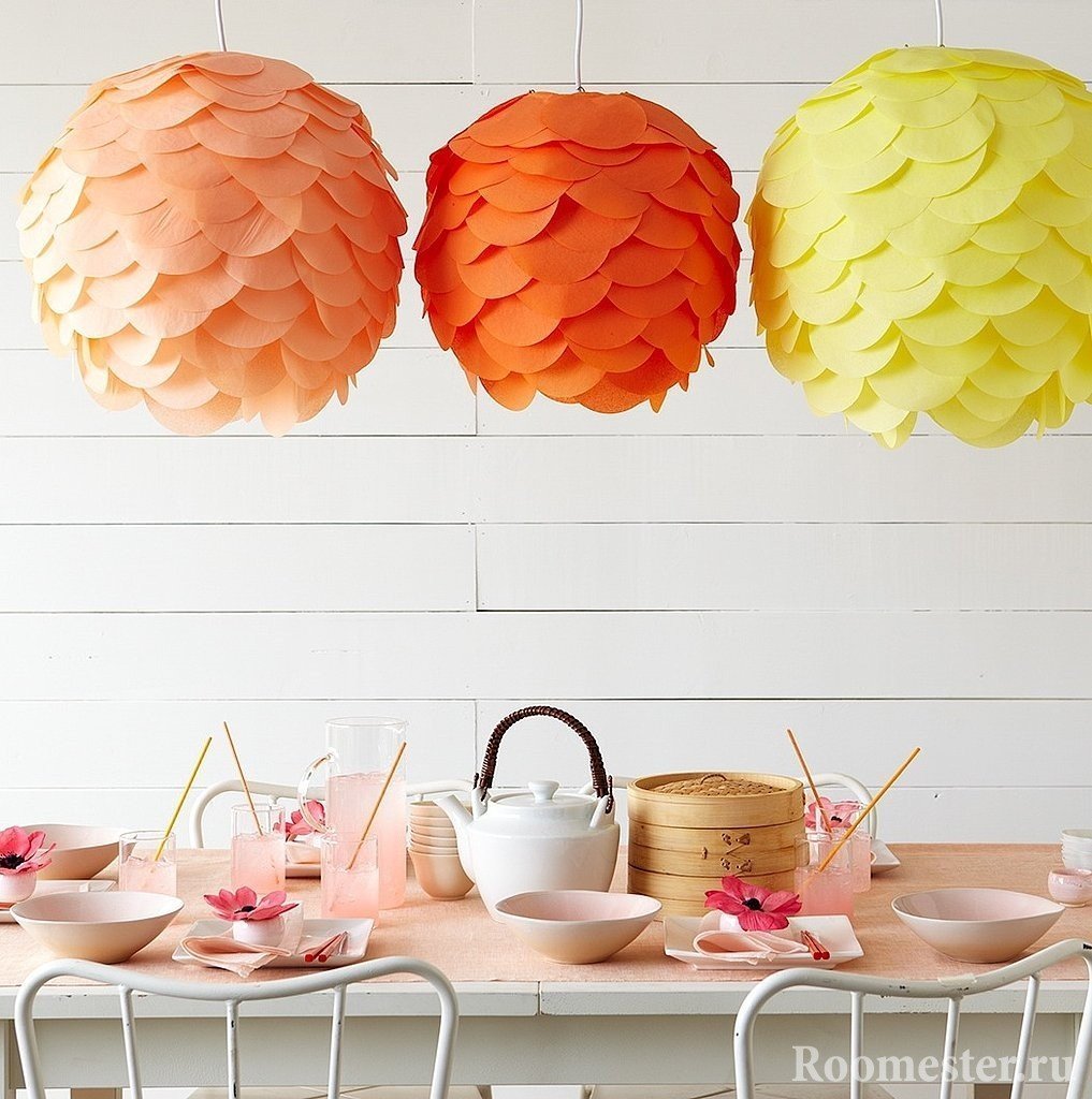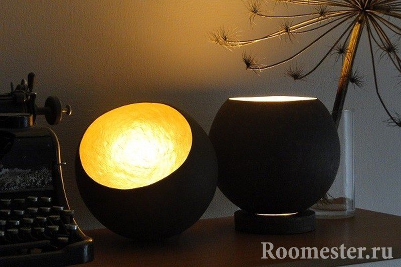 Soluciones interesantes para el diseño de interiores es una pantalla hecha de papel maché. Para la decoración, necesita papel blanco, periódicos viejos (se pueden reemplazar con hojas finas de papel), pegamento PVA, un globo y agua. Antes de comenzar a trabajar, la pelota se infla al tamaño que tendrá la lámpara. El periódico debe cortarse en tiras largas, que se dejan brevemente en pegamento o pasta. La superficie de la pelota debe estar húmeda con agua y colocar la primera capa del periódico. Una de las partes de la pelota no está sellada, ya que la luz vendrá de ella en el futuro.