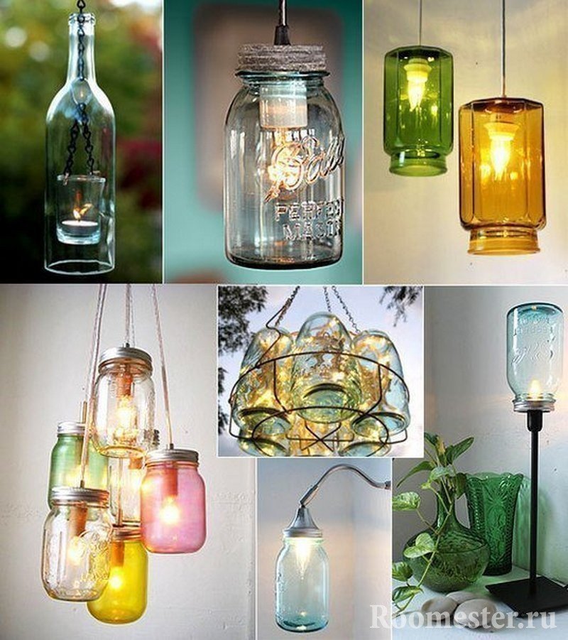 Para crear una pantalla de lámpara, puede usar frascos de vidrio de encurtidos. Colgar latas de varios niveles se convertirá en una interesante decisión de diseño en el diseño de la cocina. Además, al organizar la cocina, puede usar platillos, tazas y fragmentos de platos rotos para decorar la pantalla de la lámpara.